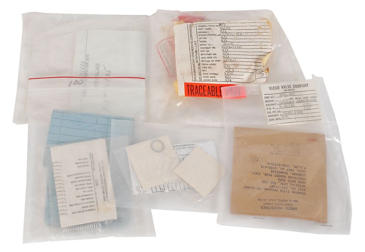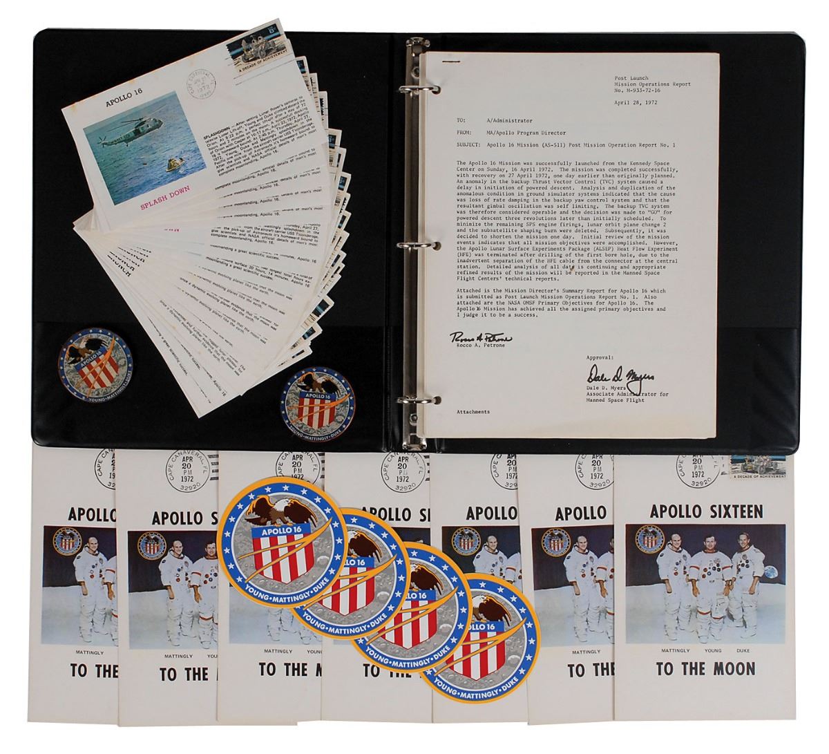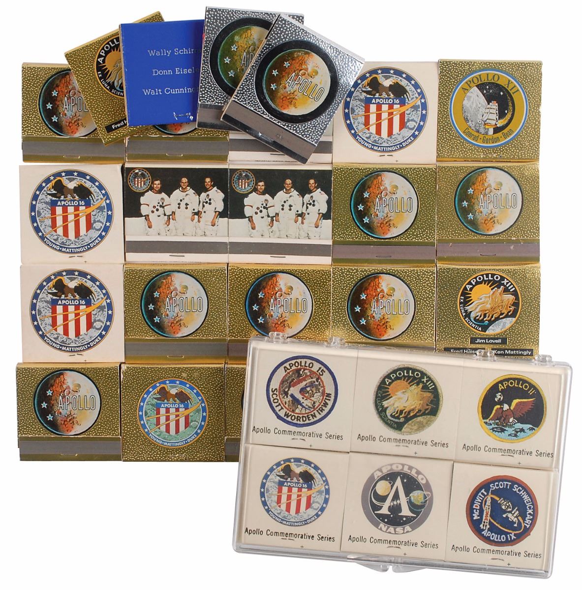 Large collection of material related to the Apollo missions, including: four types of hardware related to the Apollo Lunar Module, including an unopened helium valve, an unopened package of ‘O’ rings, two unopened packages of single metal seals, and an unopened package of four spring valves; 17 medallions commemorating the Apollo 11 mission; 36 matchbooks honoring the Apollo program, most featuring images of the various mission insignias; pair of the Apollo 14 primary and backup embroidered crew patches; decals for Apollo 13, Apollo 14, Apollo-Soyuz, Skylab, and others; and a collection of material related to Apollo 16, including booklets, two samples of access badges, decals, commemorative covers and cards, pins, and reports. In overall very good to fine condition.