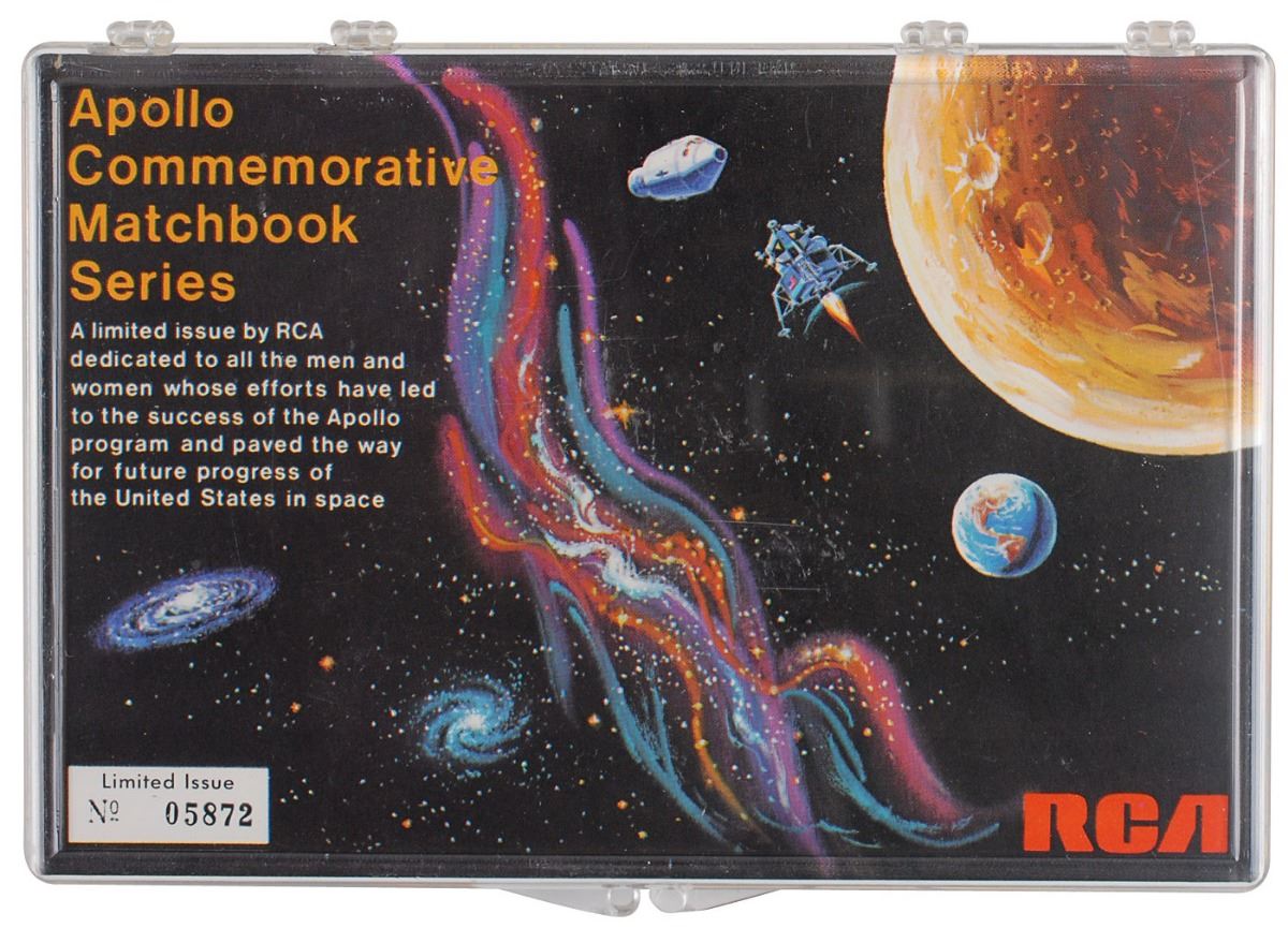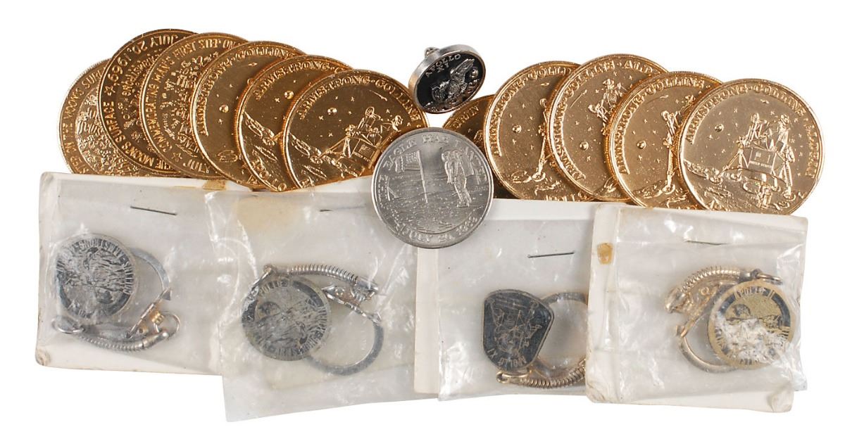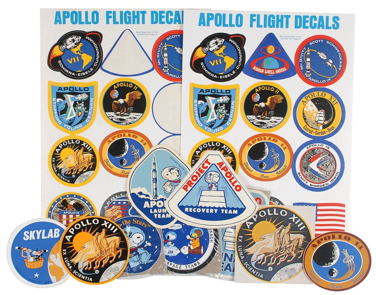 Large collection of material related to the Apollo missions, including: four types of hardware related to the Apollo Lunar Module, including an unopened helium valve, an unopened package of ‘O’ rings, two unopened packages of single metal seals, and an unopened package of four spring valves; 17 medallions commemorating the Apollo 11 mission; 36 matchbooks honoring the Apollo program, most featuring images of the various mission insignias; pair of the Apollo 14 primary and backup embroidered crew patches; decals for Apollo 13, Apollo 14, Apollo-Soyuz, Skylab, and others; and a collection of material related to Apollo 16, including booklets, two samples of access badges, decals, commemorative covers and cards, pins, and reports. In overall very good to fine condition.