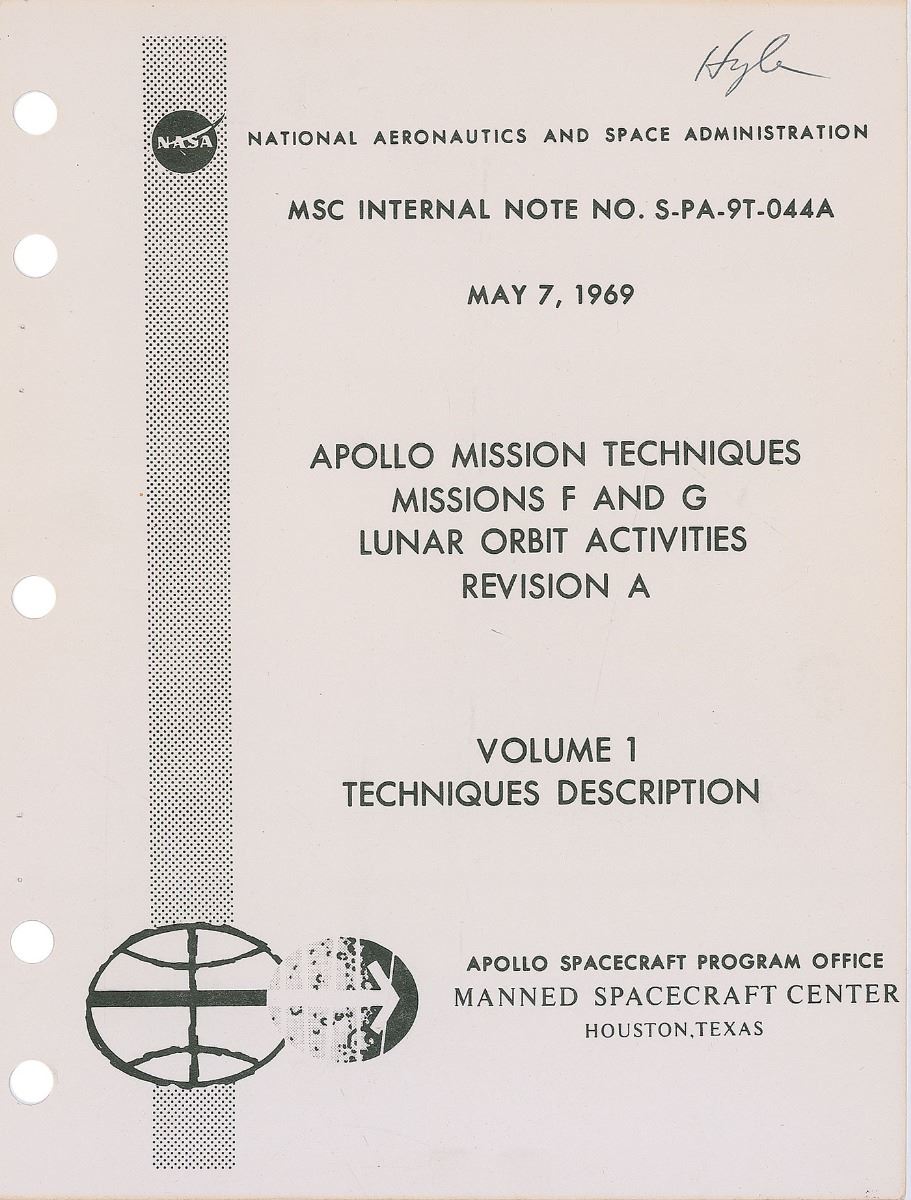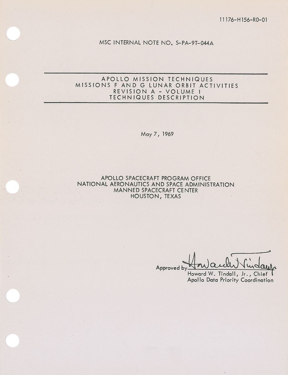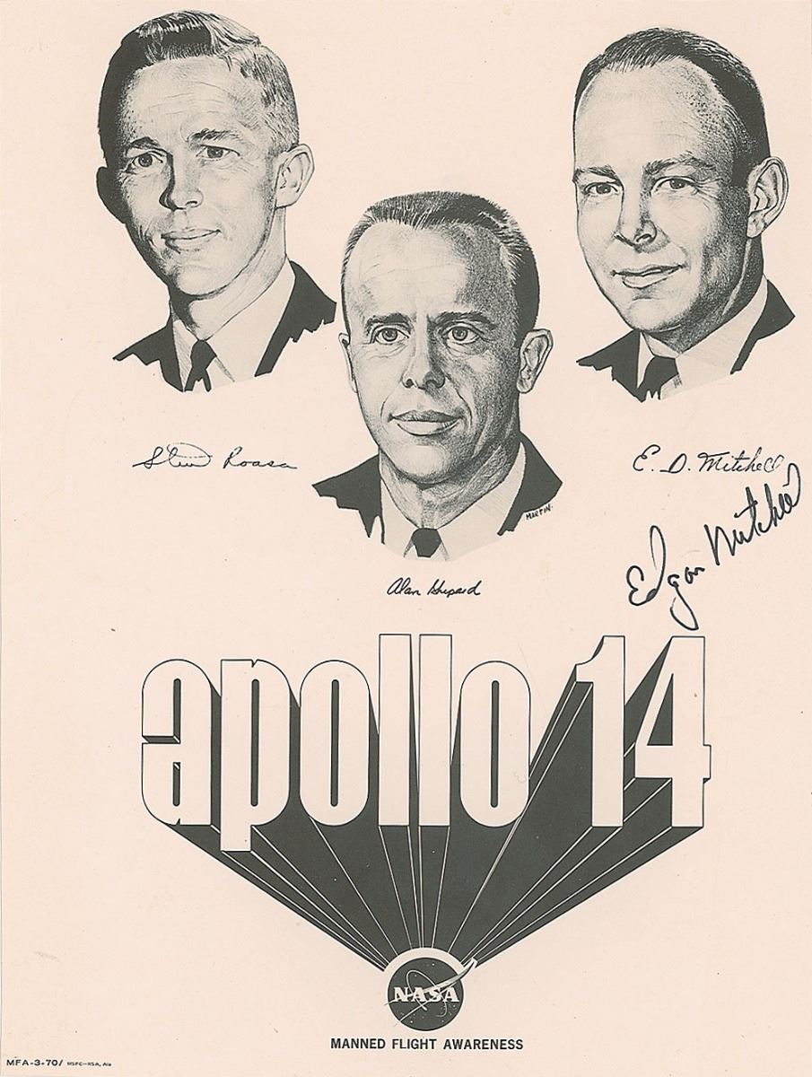 Group of material related to the Apollo missions, including: four Apollo program Manned Flight Awareness posters, ranging in size from 8 x 10.5 to 17 x 22, one of which is signed by Edgar Mitchell; an unbound NASA manual titled, “Apollo Mission Techniques Missions F and G Lunar Orbit Activities Revision A, Volume I,” 8 x 10.5, dated May 7, 1969; an unbound NASA manual titled, “Launch Vehicle Operations for Support of Space Vehicle Countdown Demonstration Test and Launch Countdown: Volume III of III,” 8.5 x 11, 61 pages, dated June 6, 1969; a series of three original color pennants, ranging in size from 19.5? to 25? long, related to Neil Armstrong; an official press release entitled ‘Lunar Exploration After the First Landing,’ from July 11, 1969; nine unsigned photos of the Apollo 11 recovery; four blocks of stamps honoring the astronauts; two unsigned photos of the moon taken during the mission and two microform cards related to Apollo photography; a press guide entitled ‘Apollo Applications Briefing,’ from January 26, 1967; and some commemorative ephemera. In overall very good to fine condition.
