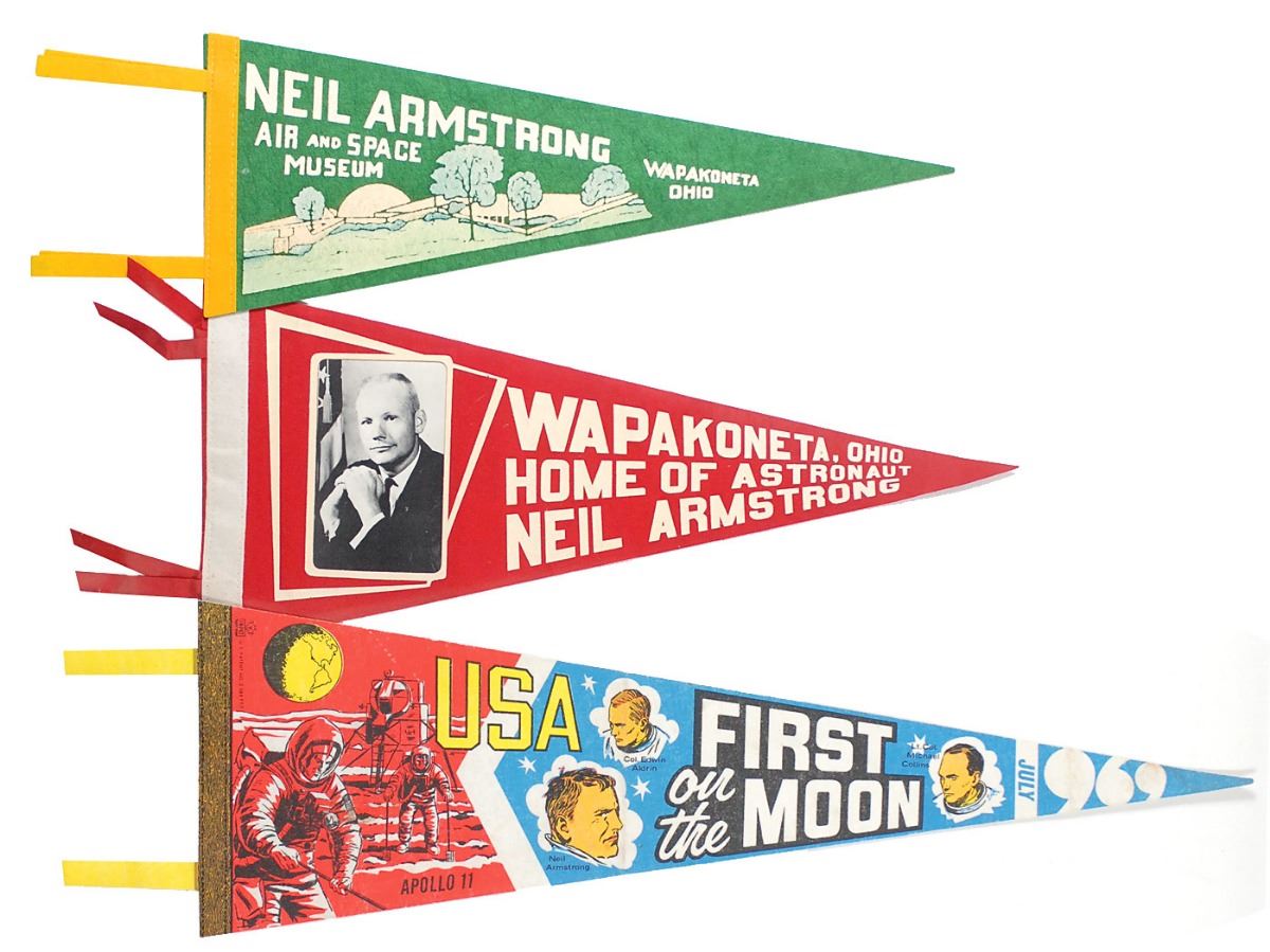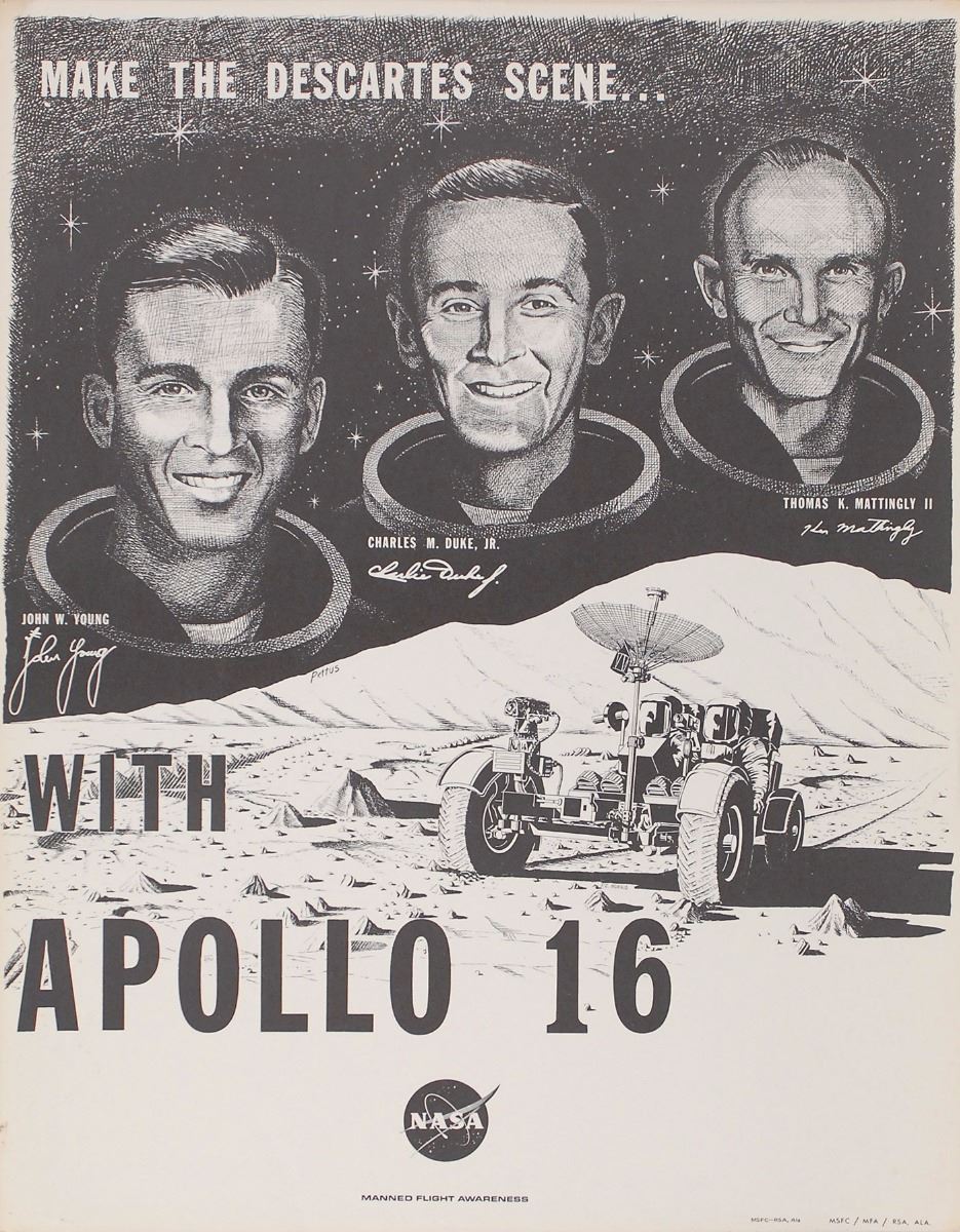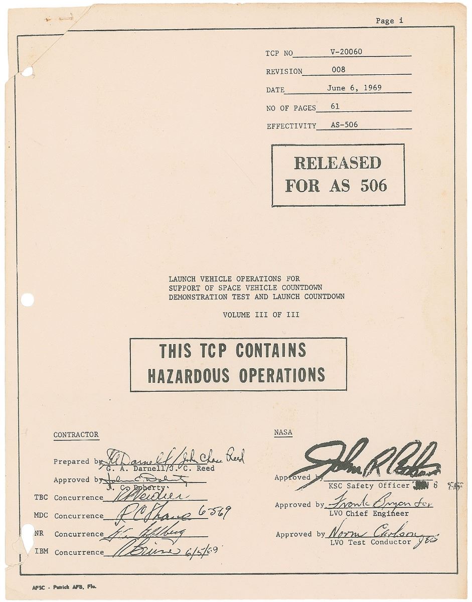 Group of material related to the Apollo missions, including: four Apollo program Manned Flight Awareness posters, ranging in size from 8 x 10.5 to 17 x 22, one of which is signed by Edgar Mitchell; an unbound NASA manual titled, “Apollo Mission Techniques Missions F and G Lunar Orbit Activities Revision A, Volume I,” 8 x 10.5, dated May 7, 1969; an unbound NASA manual titled, “Launch Vehicle Operations for Support of Space Vehicle Countdown Demonstration Test and Launch Countdown: Volume III of III,” 8.5 x 11, 61 pages, dated June 6, 1969; a series of three original color pennants, ranging in size from 19.5? to 25? long, related to Neil Armstrong; an official press release entitled ‘Lunar Exploration After the First Landing,’ from July 11, 1969; nine unsigned photos of the Apollo 11 recovery; four blocks of stamps honoring the astronauts; two unsigned photos of the moon taken during the mission and two microform cards related to Apollo photography; a press guide entitled ‘Apollo Applications Briefing,’ from January 26, 1967; and some commemorative ephemera. In overall very good to fine condition.