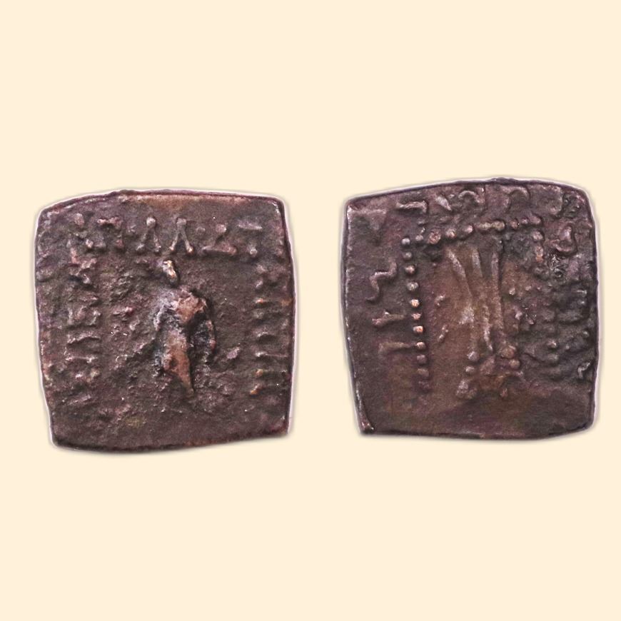 Indo-Greek, Apollodotus I (c. 180-160 BC), Square Copper Quadruple Unit, 8.32g, OBV: Apollo standing facing, with quiver over shoulder, holding arrow in right hand and left hand resting on grounded bow with Greek legend, REV: Tripod with Kharoshthi legend. (Bopearachchi & Rahman # 206). Fine.
