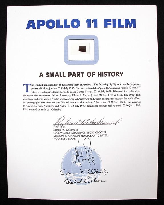 Apolo 11, 1969. FLOWN Camera Film (20x40mm.) This piece of FLOWN, unexposed photo film was salvaged by the consignor after the flight of Apollo 11. The film is part of the unexposed leader of the film roll used by the Apollo 11 crew on the lunar surface on July 20th and represents a piece of the first photogrpahic film used on the moon. Mounted on a signed, blue/white, "Underwood" certificate of authenticity, this is an important piece of memorabilia.