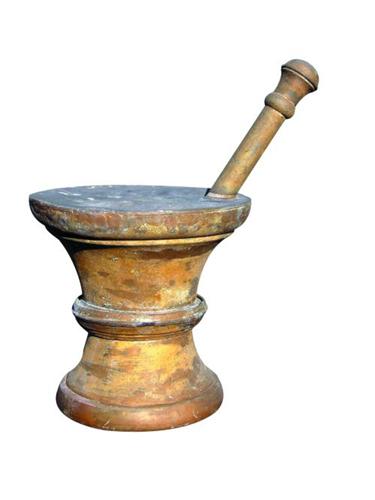 Apothecary Trade Symbol, mortar and pestle made of zinc. Hung outside the buildings in the 1800s, these trade signs were used to let people know what type of business you had in case they couldn't read. Good original condition. 24 X 15 inches.