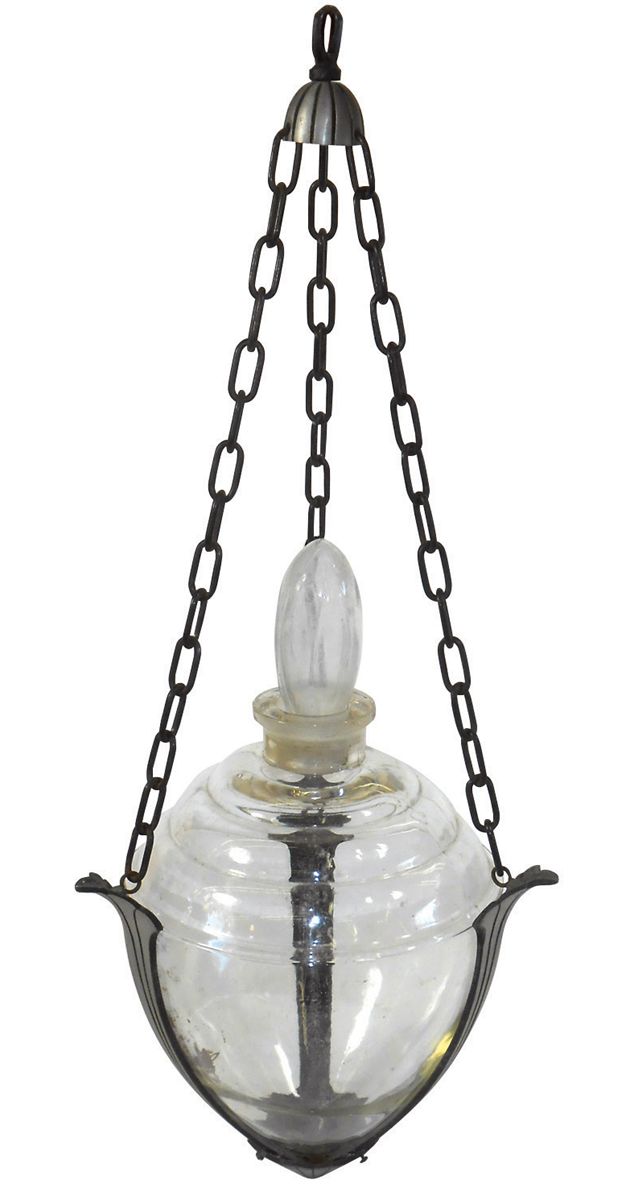 Apothecary hanging show globe, Art Deco design, glass globe in cast aluminum hanger, c.1920's, Exc cond, 30"L w/chain. See matching globe in Lot #356.