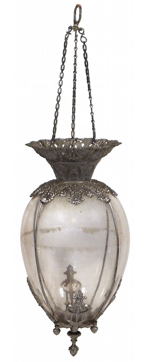 Apothecary hanging show globe, teardrop-shaped glass globe in fancy cast iron frame, c.1880's, Exc c