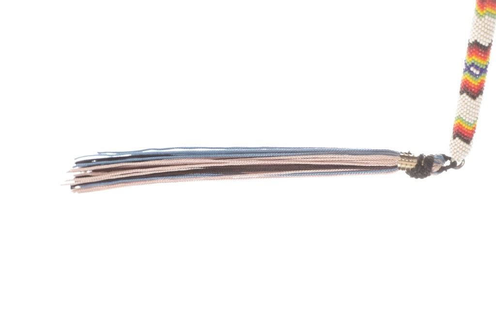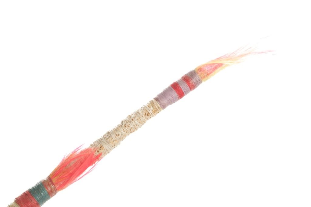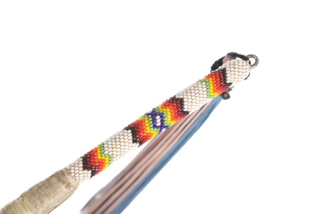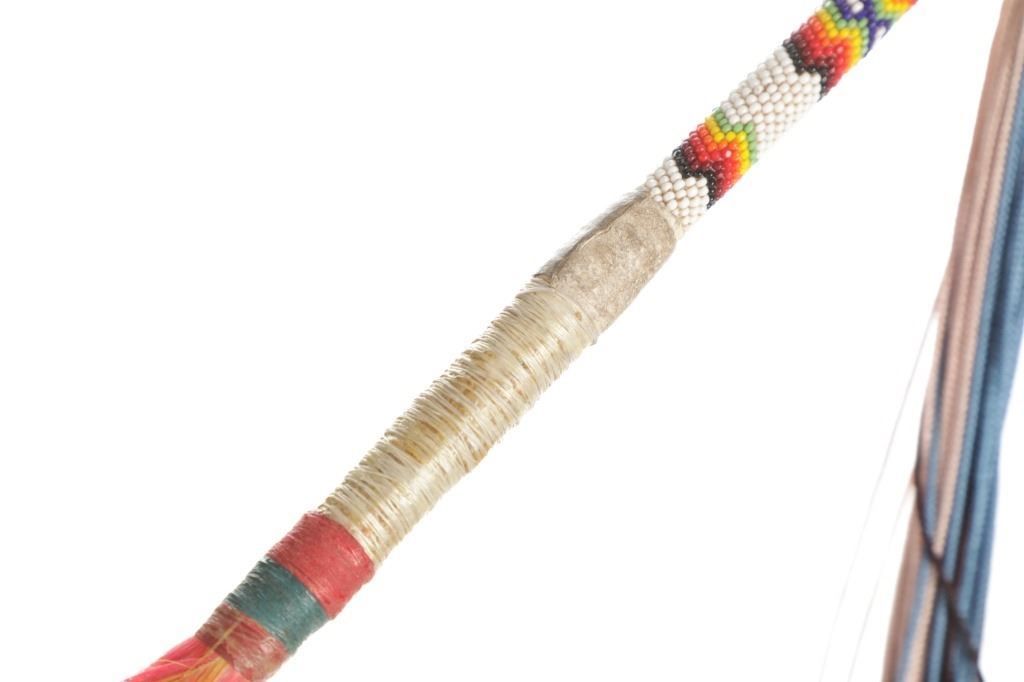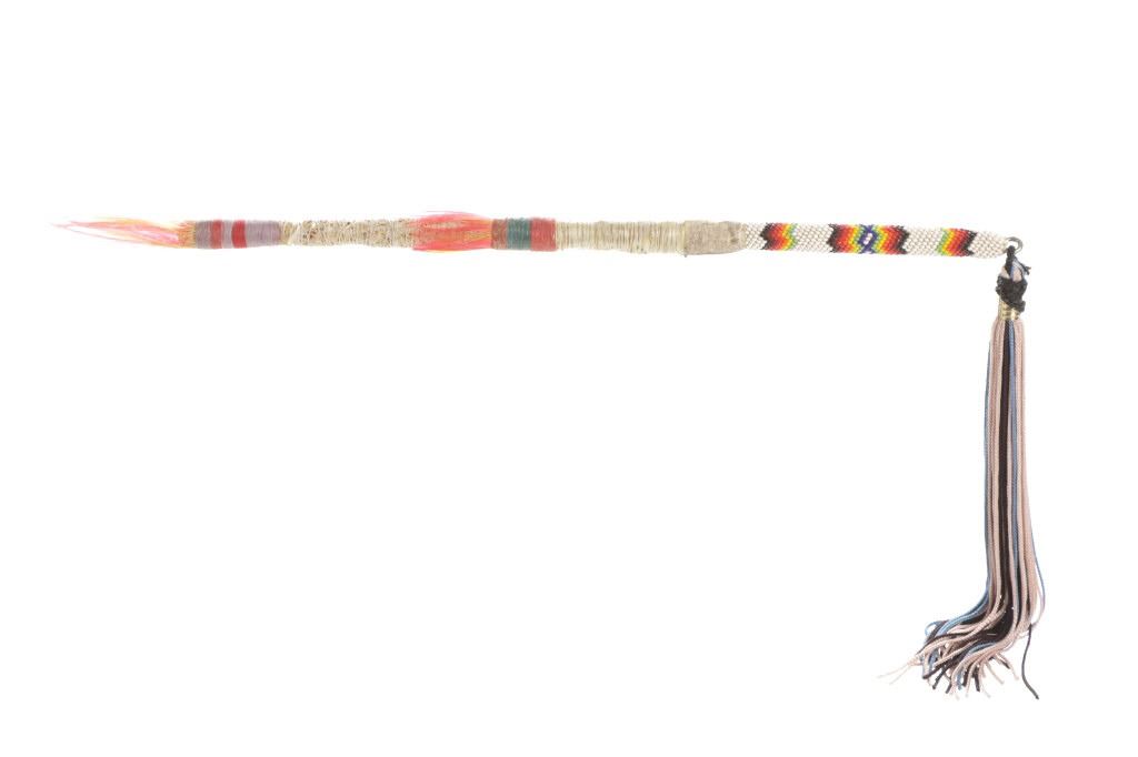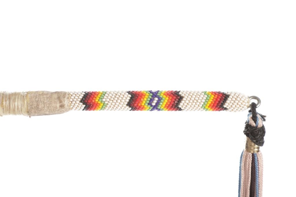 Featured in this lot is this beaded dancing wand from the Appalooska Crow tribe circa 1970's. This dancing wand features a lovely decoration of trade seed beads including chalk white, light green, medium red, orange, blue, maroon, and black. The dancing wand also features a sinew wrapped core with a small piece of Parfleche hide and dyed sinew wrapped around colored feathers. The top adornment is comprised of a swivel design with multi color sting hanging from it. The condition of this dancing wand is good with no obvious signs of damage and in good overall condition. The measurements of this dancing wand are 21"  x 1/2" x 1/2".
