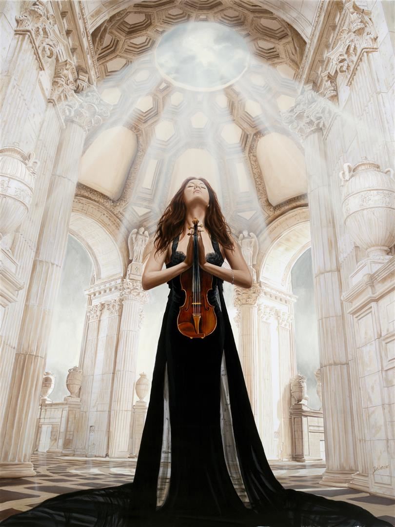 Appassionata by Dellorco. 48"x36" The violinsit relaxes during rehearsal . "Appassionata" is Ltd.Edition giclee on canvas. Artist s/n. Edition 195.