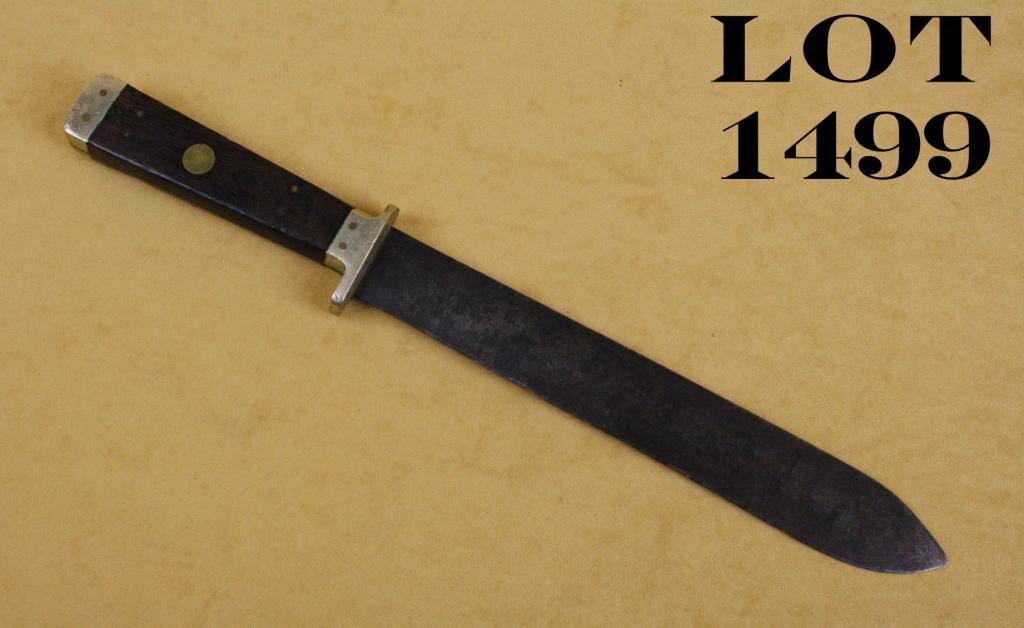 Appealing old hunting knife approx. 15” overall with an approx. 10” blade marked “J. Sainsbury Ltd.” In overall worn but good condition showing a dark patina on the blade with some evidence of old sharpening , somenicks to edge from use and some scattered spots of erosion and light pitting; the wood grips are well worn with scalloped finger grooves to the wood scales that are attached to the knife via four small brass pins and alarger brass flush rivet; the cross guard and pommel are simple in construction but also secured by flush brass pins; some mars, cracks and good honest wear to the wood. Est.: $200-$400.