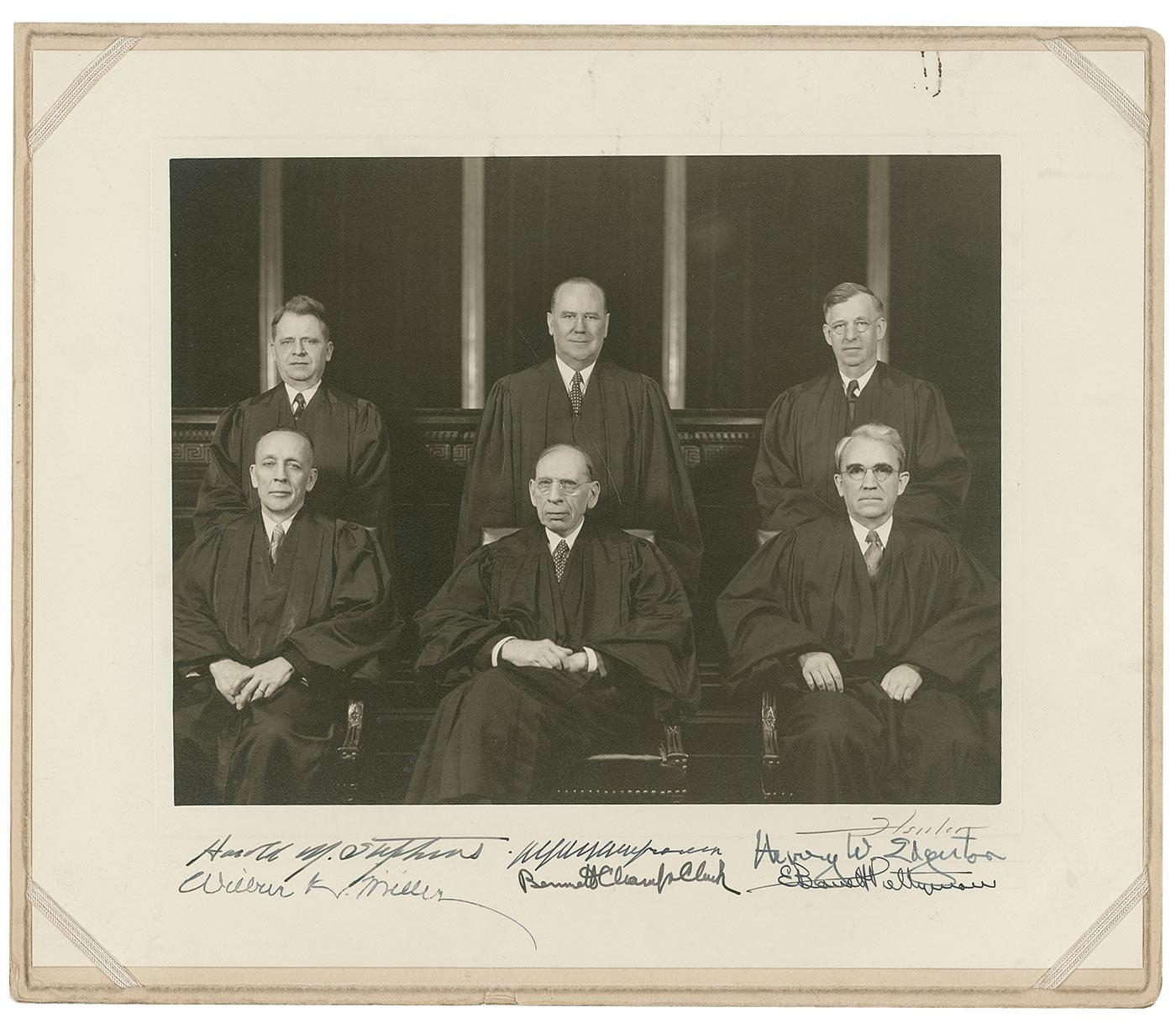 Vintage matte-finish 12.5 x 10.25 Hessler studio portrait of the United States Court of Appeals for the District of Columbia Circuit, signed in fountain pen at the bottom border by six members: Bennett Champ Clark, Henry W. Edgerton, Wilbur K. Miller, E. Barrett Prettyman, James McPherson Proctor, and Harold M. Stephens. In fine condition, with a rusty paperclip impression at the top edge and silvering to some of the darker portions. The image is contained within its original presentation folder.