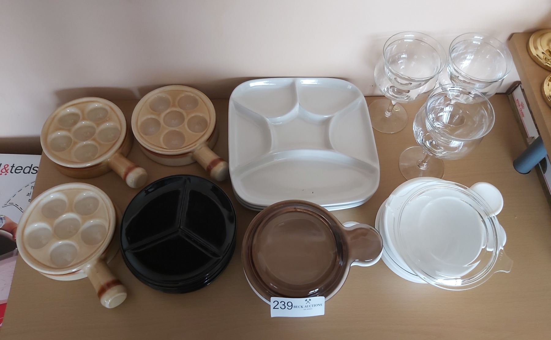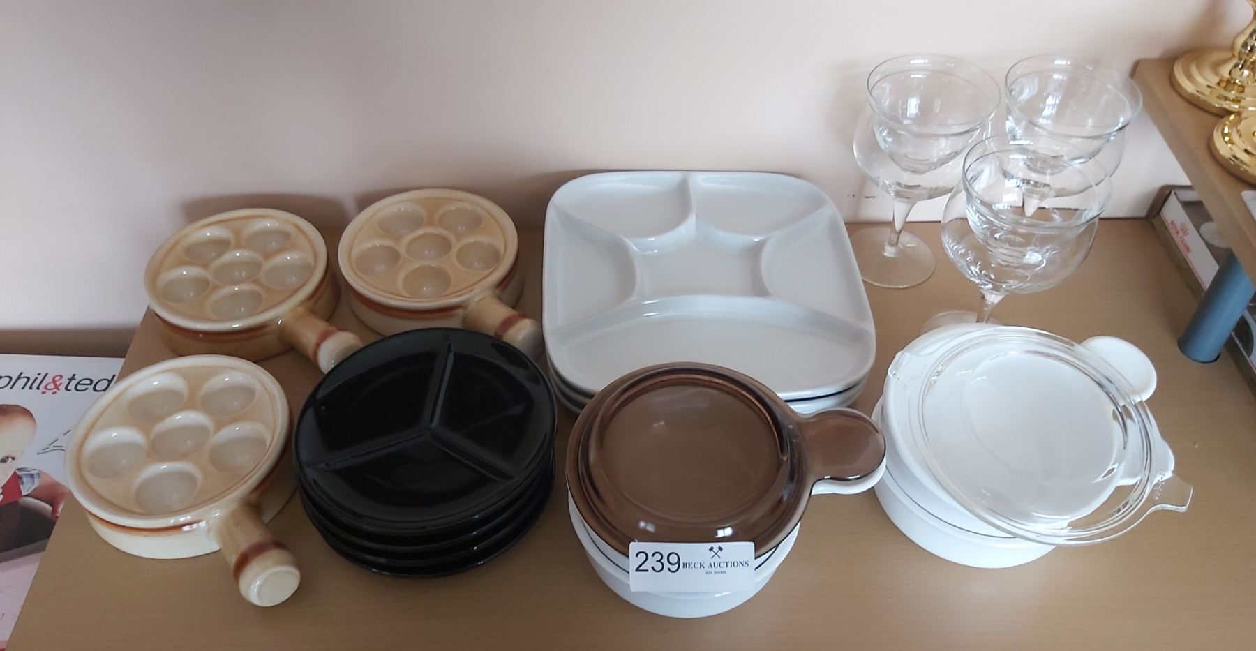 3 escargot, 3 large plates, 4 bowls, 3 shrimp cocktail, 4 small plates.