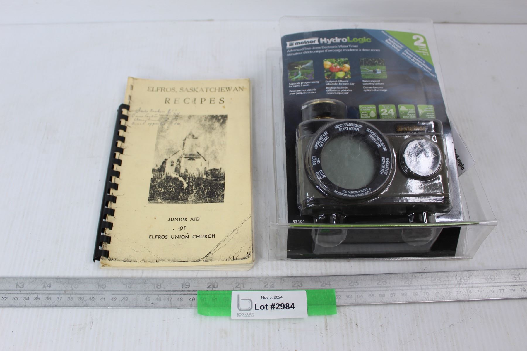 Appetizers Elfros Sask Recipe Book , Melnor Hydro Logic Advanced Two- Zone Electronic Water Timer w/ Box- As Is