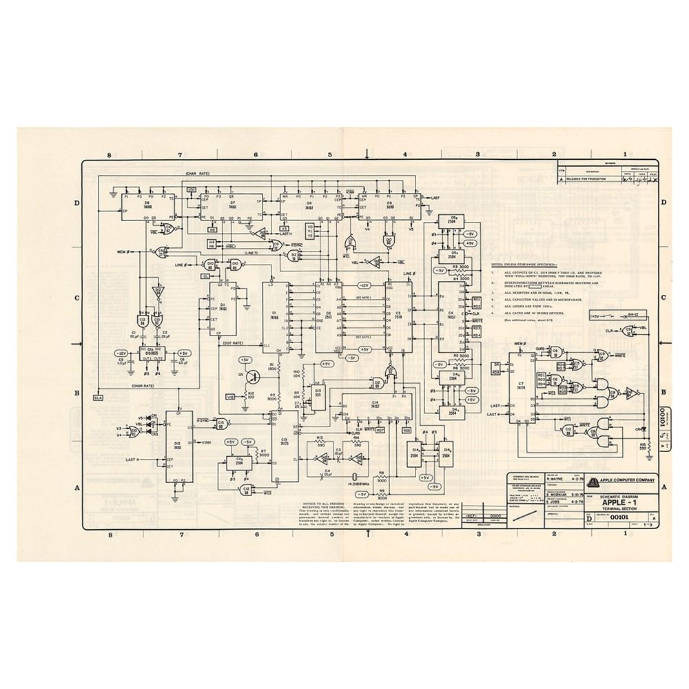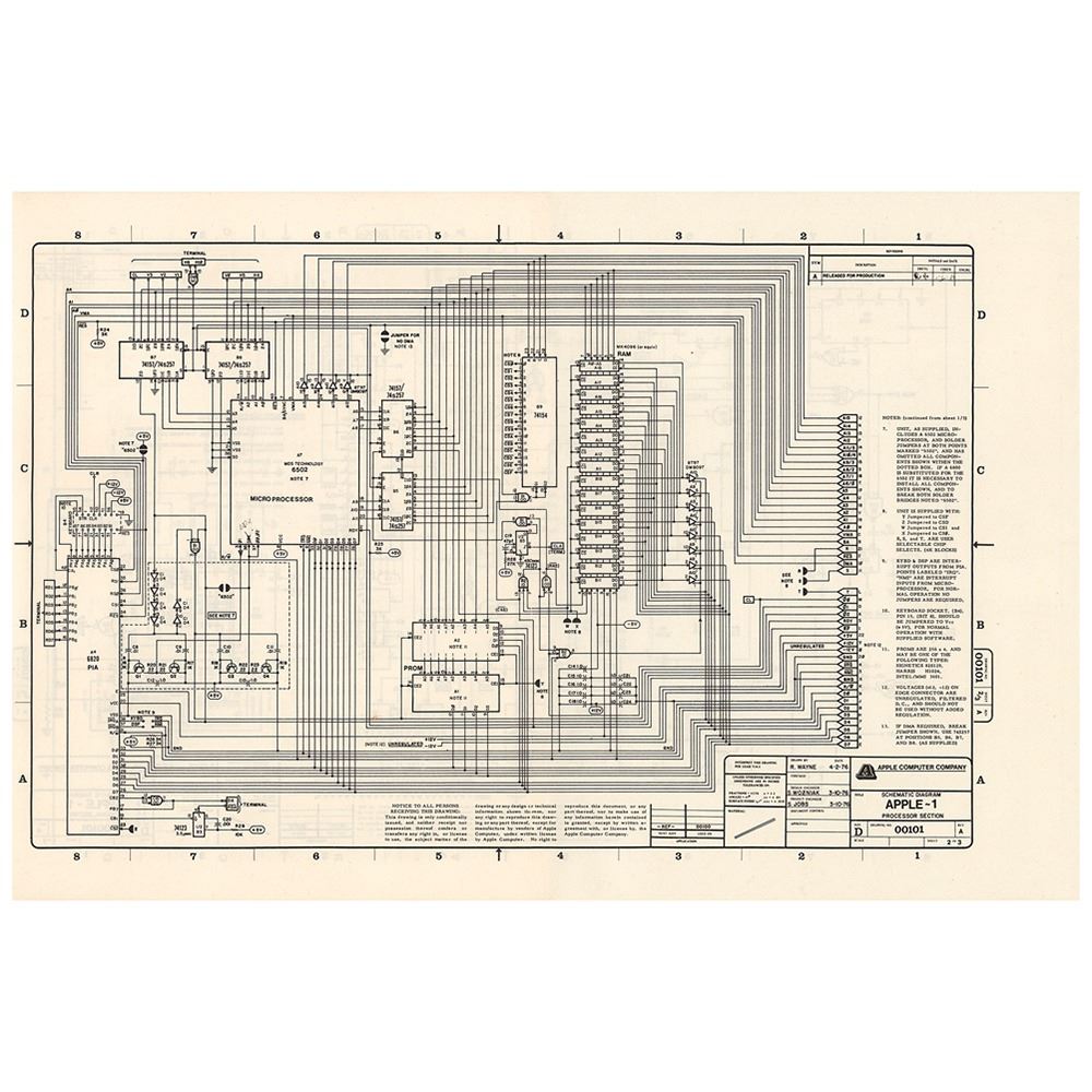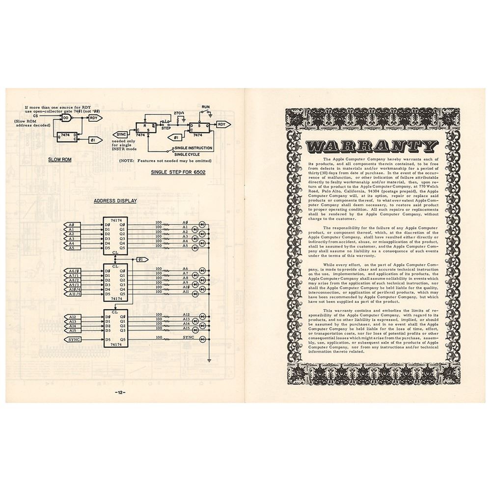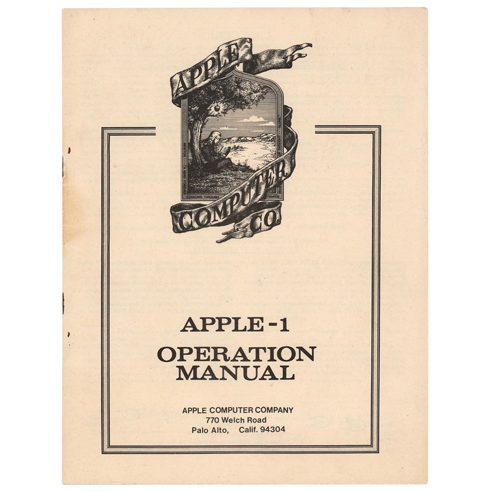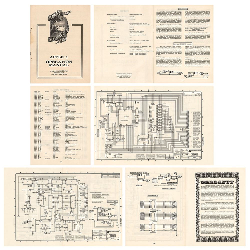 Extremely rare original vintage Apple-1 Operation Manual issued by the Apple Computer Company circa 1976, 12 pages, 8.5 x 11, featuring Apple's original logo on the front cover, designed by third Apple co-founder Ron Wayne and showing Isaac Newton thoughtfully seated beneath a tree, with a shining apple dangling overhead. The Operation Manual features information on getting the system up and running, using the system monitor, and expanding the Apple system, and features an impressive fold-out schematic of the Apple-1 computer. It also has a page headed "6502 Hex Monitor Listing," for an innovative memory program devised by Steve Wozniak which is commonly called the 'Woz Monitor.' In fine condition, with a faint stain to the left edge of the front cover. This superior example is not three-hole punched, and has no further staining or notations inside.