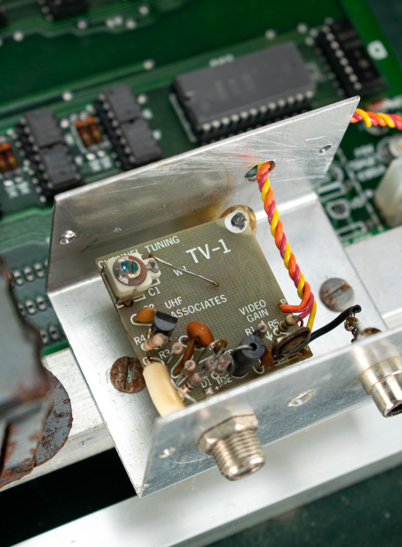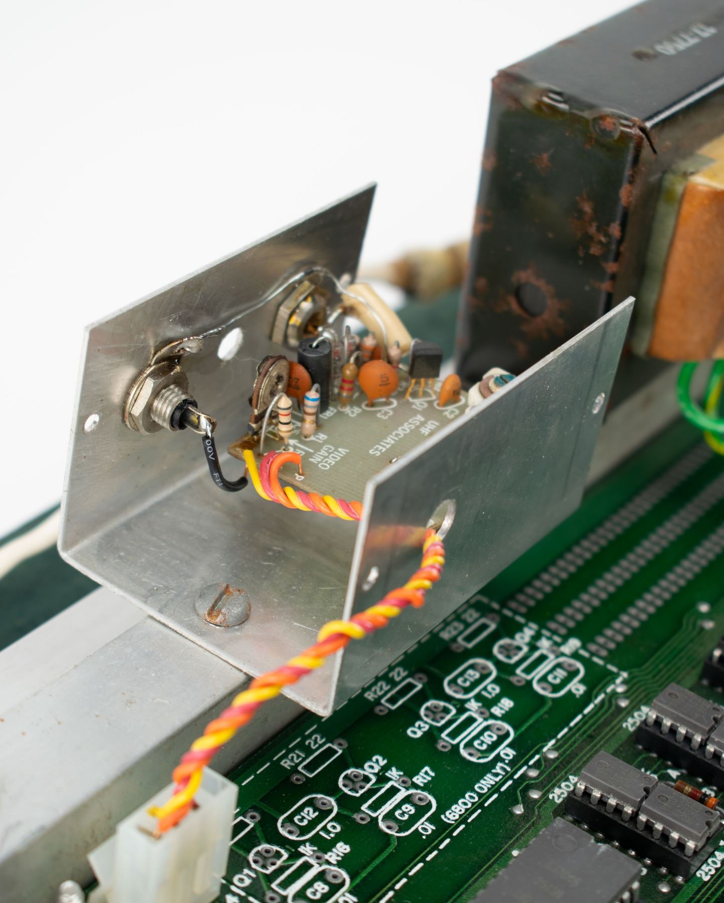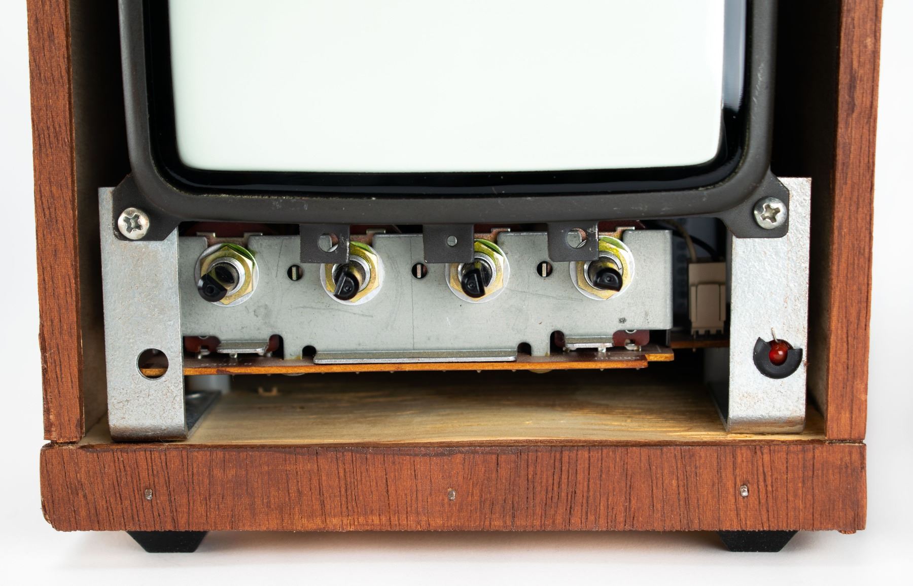 Another central characteristic of the Apple-1 is its built-in video terminal, which allows output to a television screen or video monitor. This was a dramatic advance from the traditional computer input/output mechanism of the day, the ASR-33 teletype, which printed a computer’s output onto a spool of paper. With this video port, the Apple-1 allowed a user to view commands on a screen in real time—something taken for granted in today’s computing world. Included with this Apple-1 is a period open frame ‘security’ monitor in a homemade wooden case, and a period hobbyist-assembled terminal keyboard 'kit' wired for this Apple-1. Interestingly, the keyboard has no 'return/enter' key; instead, this functionality is accessed by pressing the and keys concurrently.