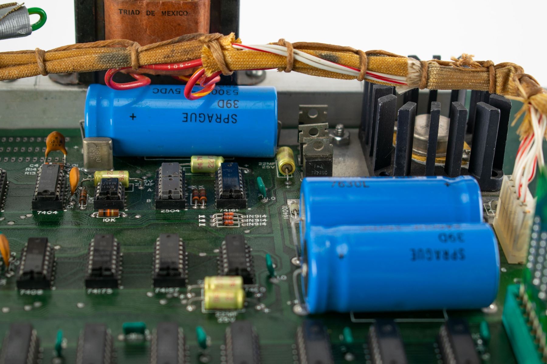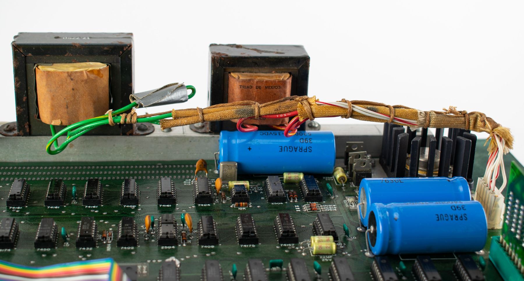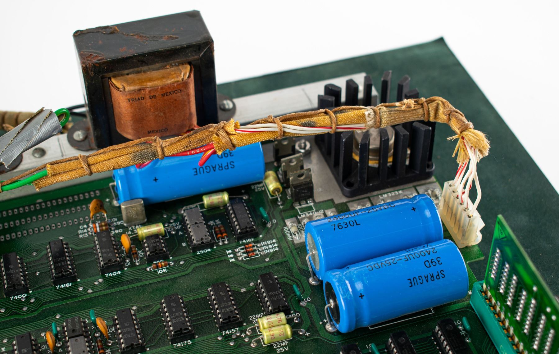This Apple-1 additionally includes an original Apple-1 Cassette Interface (ACI), also introduced in 1976, which provides the ability to save memory contents onto a standard audio tape, and later load the contents back into the computer’s memory. Revolutionary for the time, Steve Wozniak designed the ACI to use only 6 integrated circuits, compared to other solutions which used 50 to 100 integrated circuits. This allowed Apple to sell their solution for less than their competitors; the Apple ACI also operated at four times the speed of its contemporary competitors.