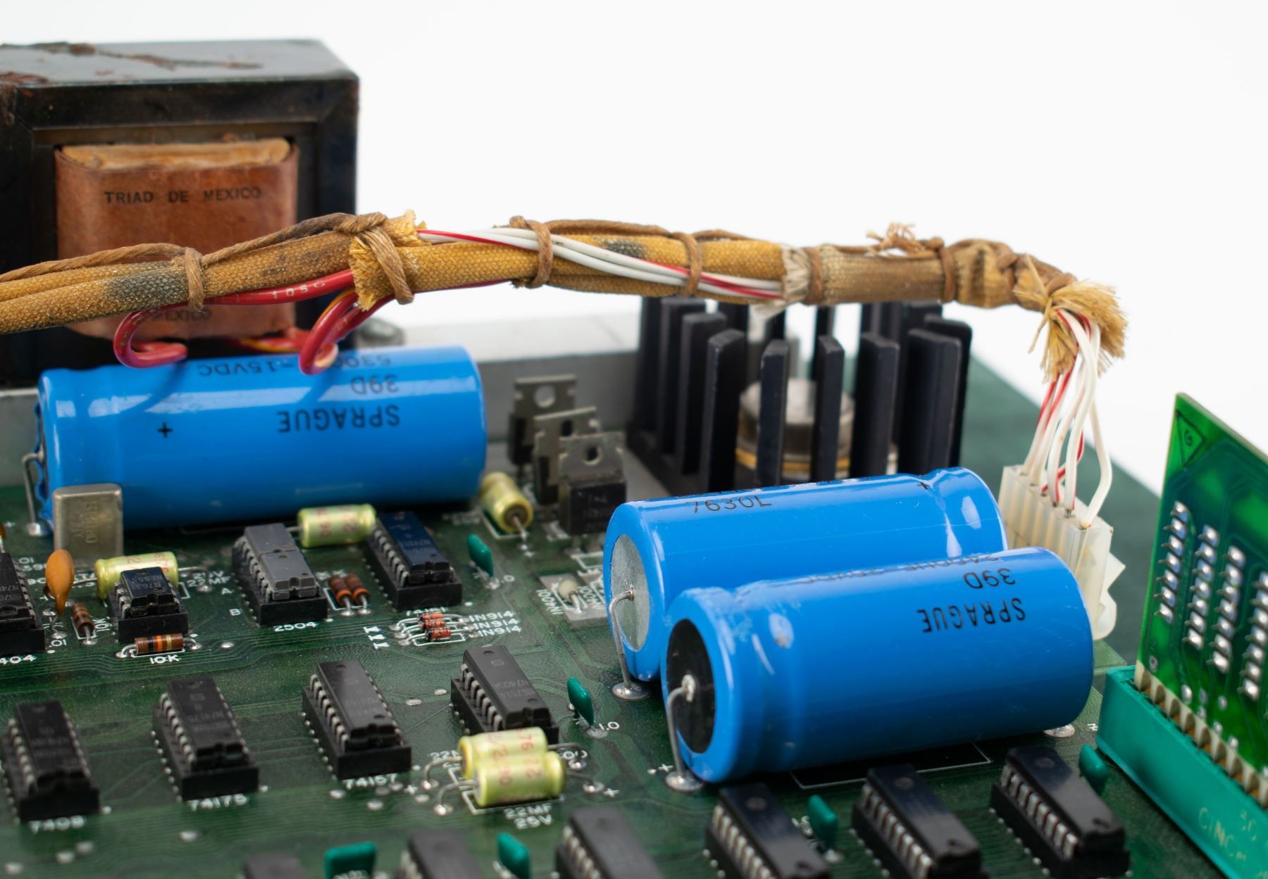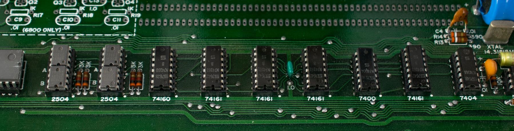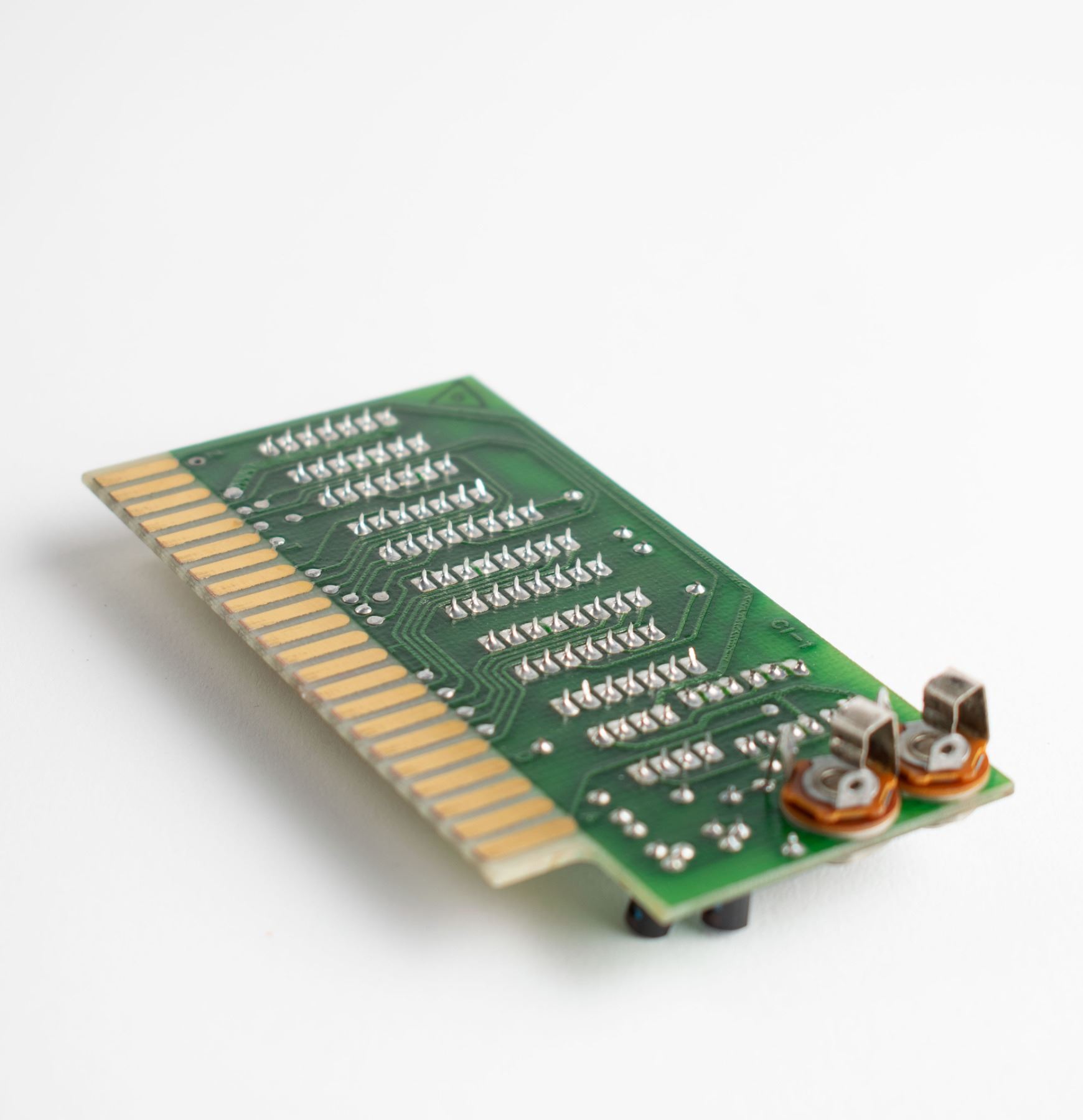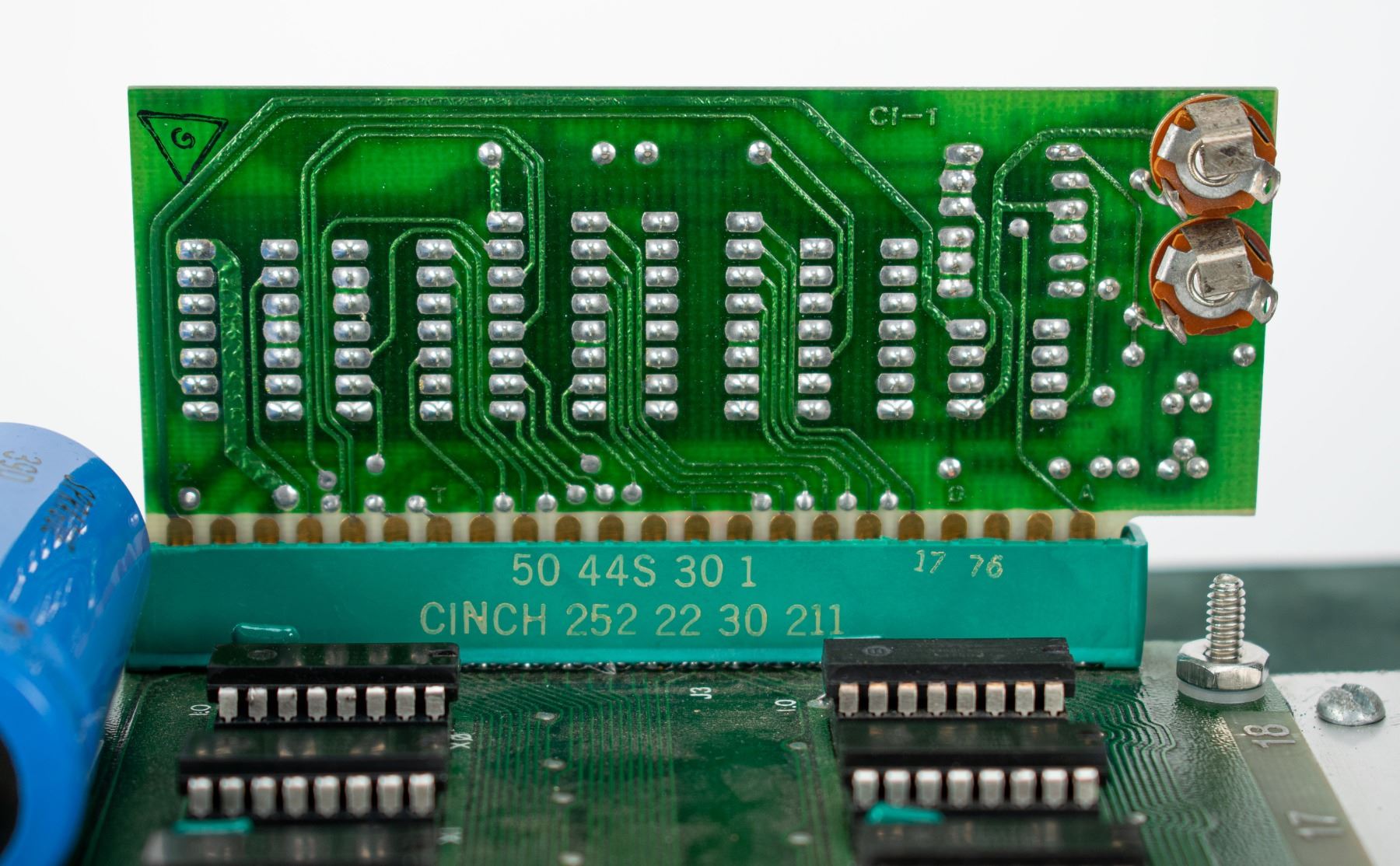 This Apple-1 additionally includes an original Apple-1 Cassette Interface (ACI), also introduced in 1976, which provides the ability to save memory contents onto a standard audio tape, and later load the contents back into the computer’s memory. Revolutionary for the time, Steve Wozniak designed the ACI to use only 6 integrated circuits, compared to other solutions which used 50 to 100 integrated circuits. This allowed Apple to sell their solution for less than their competitors; the Apple ACI also operated at four times the speed of its contemporary competitors.