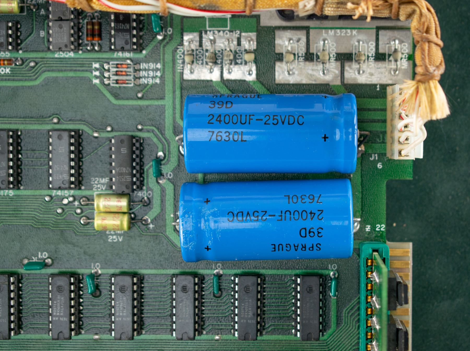 On the left side, the board is marked: “Apple Computer 1, Palo Alto, Ca. Copyright 1976.” This appears to be one of the last populated NTI Apple-1 boards, as indicated by the use of all yellow 22mf electrolytic capacitors and the rare white 1976 ceramic Synertek C6502 CPU from the 43rd week of 1976. This is one of two known surviving NTI Apple-1 which used this processor; most known Apple-1 used MOS 6502 microprocessors. The Synertek C6502 is considered to be the rarest example of a licensed 6502 CPU from 1976.