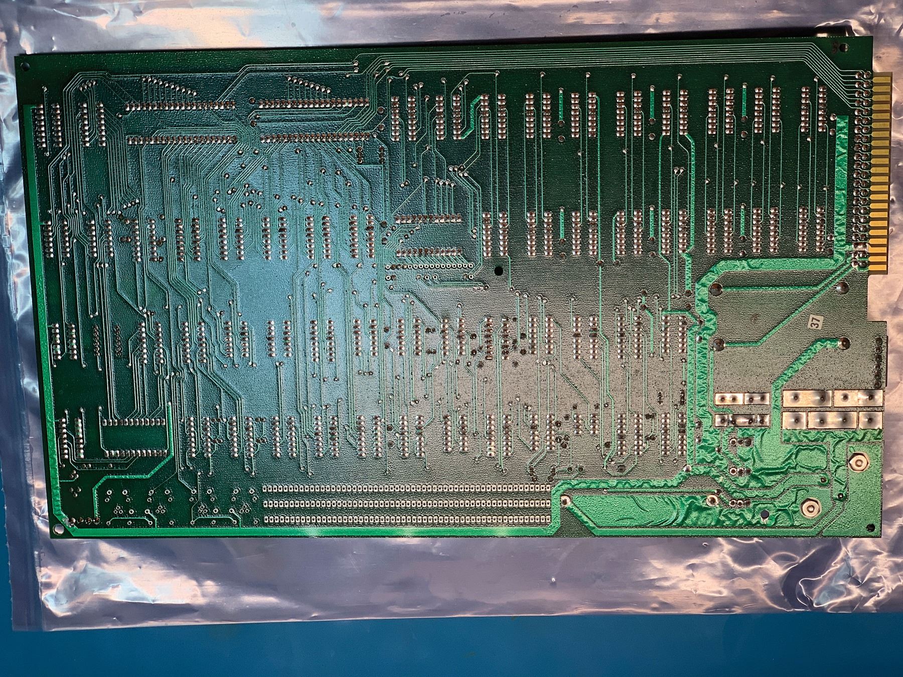 This Apple-1 board is also configured with 8K of Mostek RAM installed. The reverse side of the board has no modifications or circuit traces that have been cut or repaired. The prototype area is clean and un-used. The green coat on the reverse is in very good condition without the typical peeling from the original wave-soldering manufacturing process; it also retains the intact lot "37" sticker seen on some Apple-1 NTI units. This is one of the best NTI examples known to date.