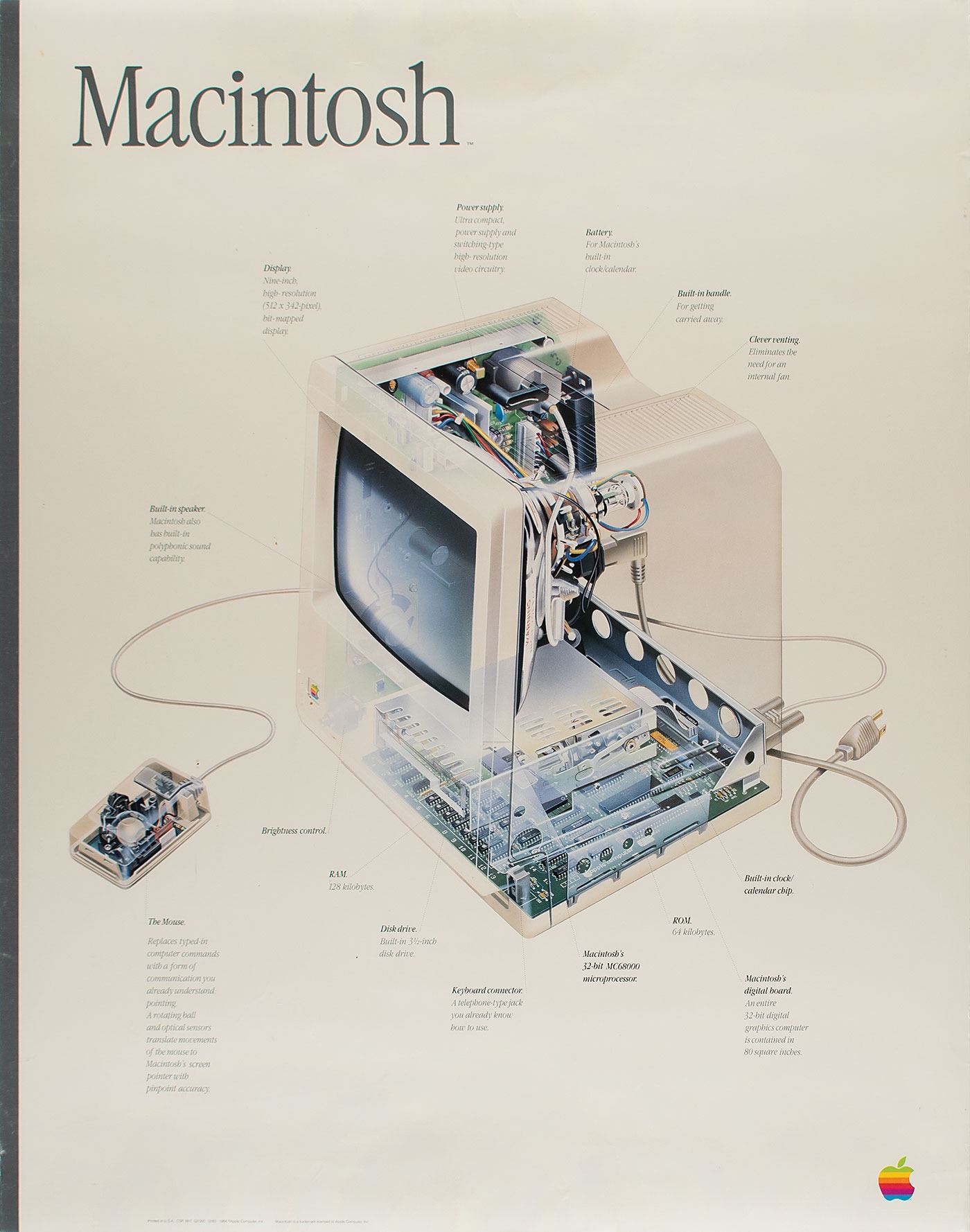Scarce 1984 color 21.5 x 27.75 Apple Computer promotional poster for the launch of the original Apple Macintosh personal computer, the Macintosh 128K, which depicts an X-ray or cutaway image of the computer and mouse, with surrounding text identifying its various parts and components, such as: “Display,” “Power supply,” “Battery,” “Built-in handle,” “Clever venting,” “Built-in speaker,” “Brightness control,” “The Mouse,” “RAM,” “Disk drive,” “Keyboard connector,” “Macintosh’s 32-bit MC68000 microprocessor,” “ROM,” “Built-in clock / calendar chip,” and “Macintosh’s digital board.” Rolled and in fine, never-before-displayed condition, with a few trivial creases. This poster derives from the personal collection of a former employee of Apple Computer, Inc.