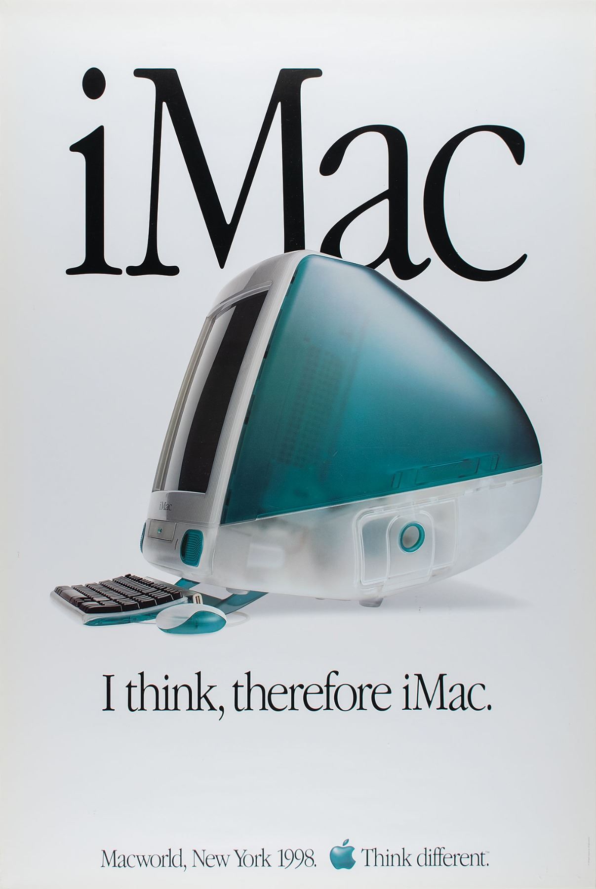 Sought-after color 24 x 36 Apple Computer poster for the launch of the first iMac G3 personal computer at the 1998 New York Macworld Expo, held at the Javits Convention Center in New York City on July 7, 1998, which shows the iMac in its iconic Bondi Blue between black upper and lower text: “iMac” and “I think, therefore iMac / Macworld, New York, 1998. Think different.” Rolled and in fine condition, with a few trivial creases. This poster derives from the personal collection of a former employee of Apple Computer, Inc.