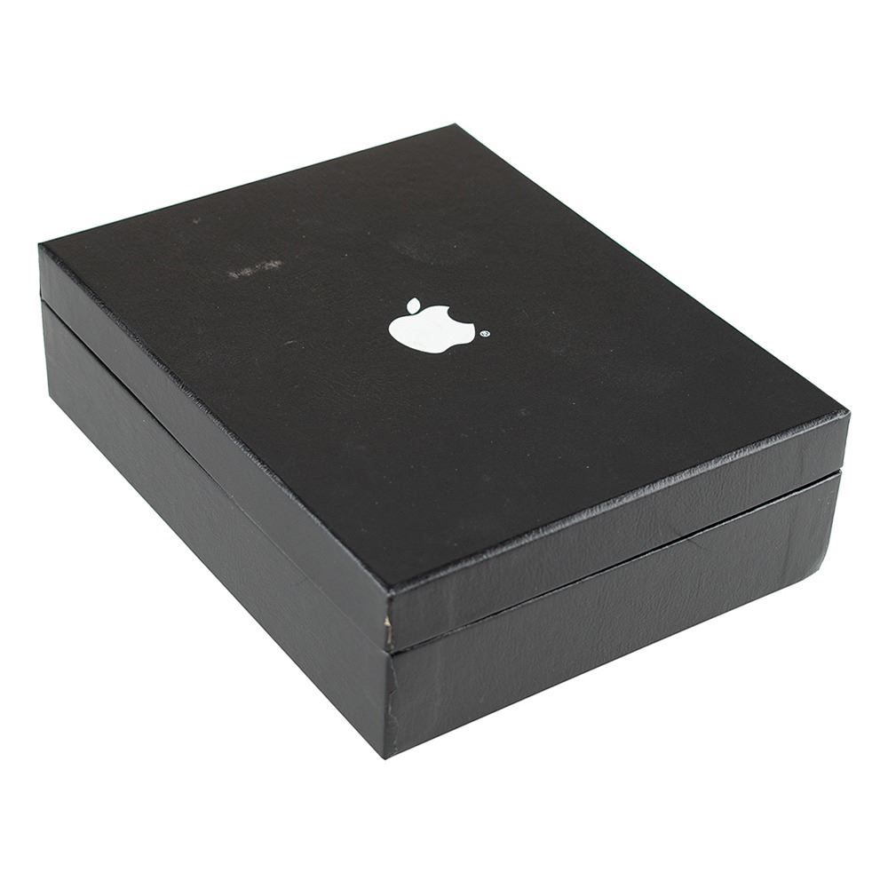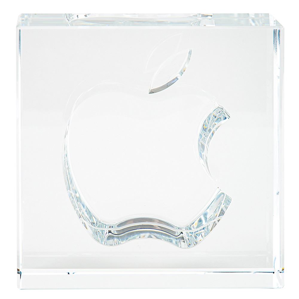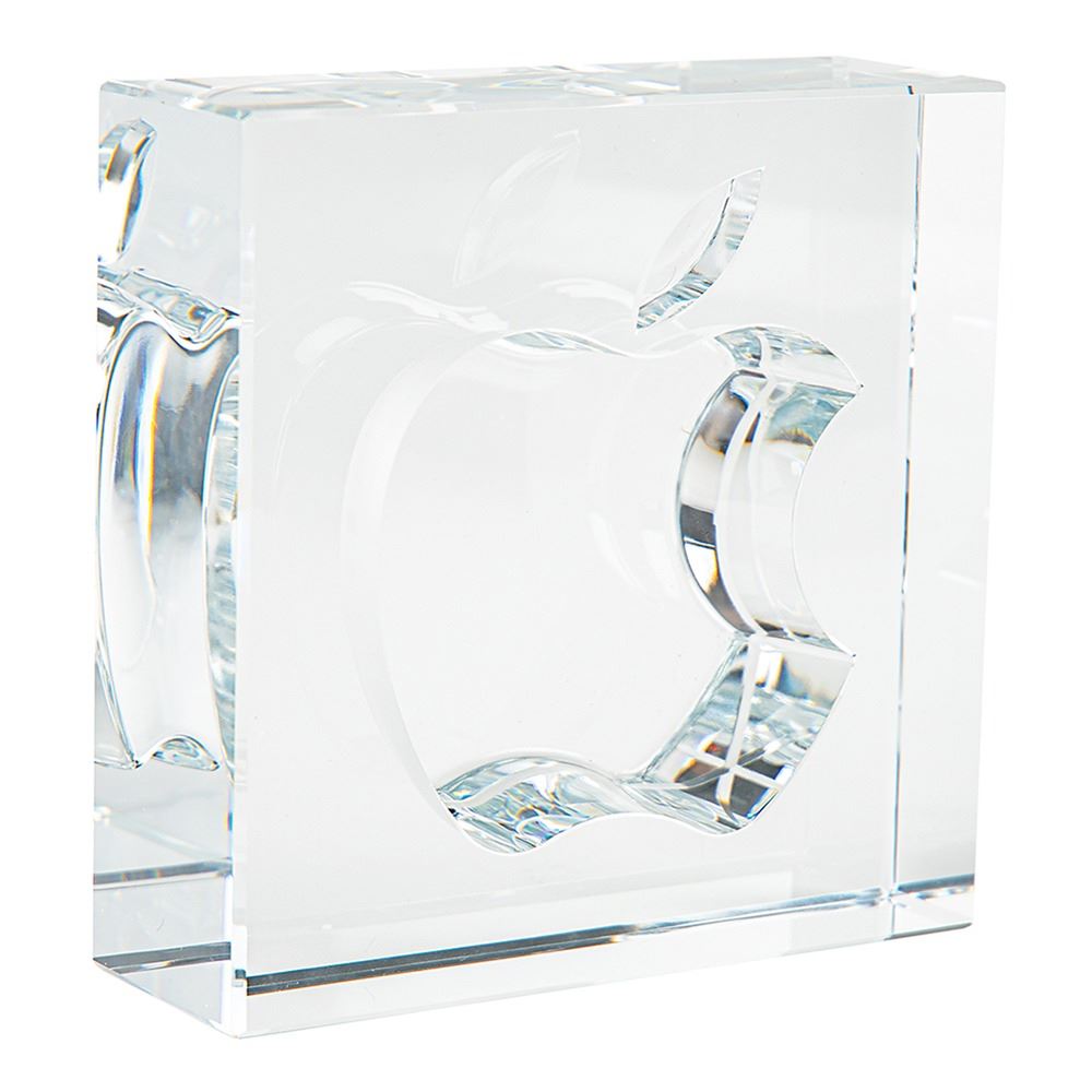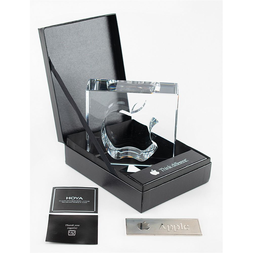 Rare and highly displayable 20th Anniversary Apple Award made by the Hoya Crystal Corporation of Tokyo, Japan in 2002. This gorgeous limited edition crystal award, which features a central, expertly cut Apple logo depression, measures 6.25 x 6.25 x 2.25 and weighs approximately 7.5 pounds. The award is accompanied by its original presentation box and slipcase, with Hoya thank you card, instruction booklet, and metal plaque. In fine condition, with some wear and scuffing to box and slipcase.