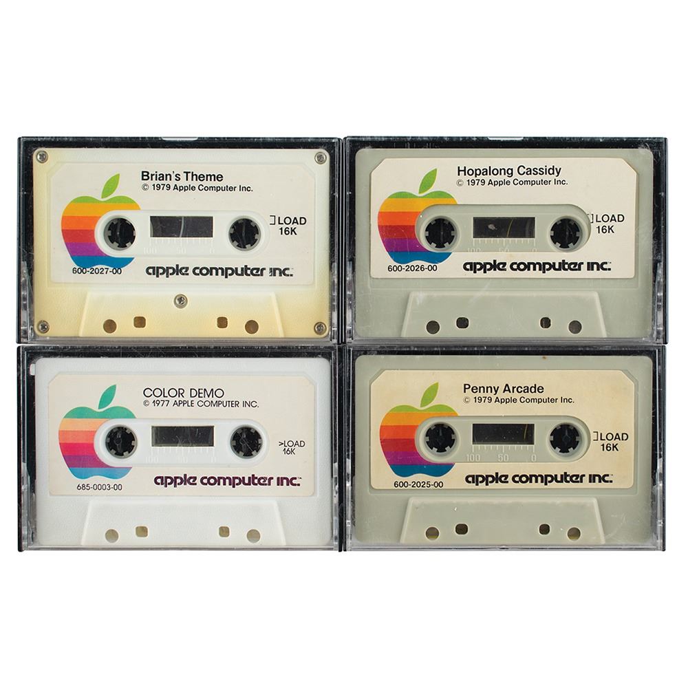 Uncommon group lot of four Apple Computer basic program cassette tapes for the 16K Apple II home computer, including: Color Demo (1977) and Brick Out (1978); Penny Arcade and Finance I (1979); Hopalong Cassidy and Lemonade (1979); and Brian’s Theme and Phone List (1979). In overall fine condition.