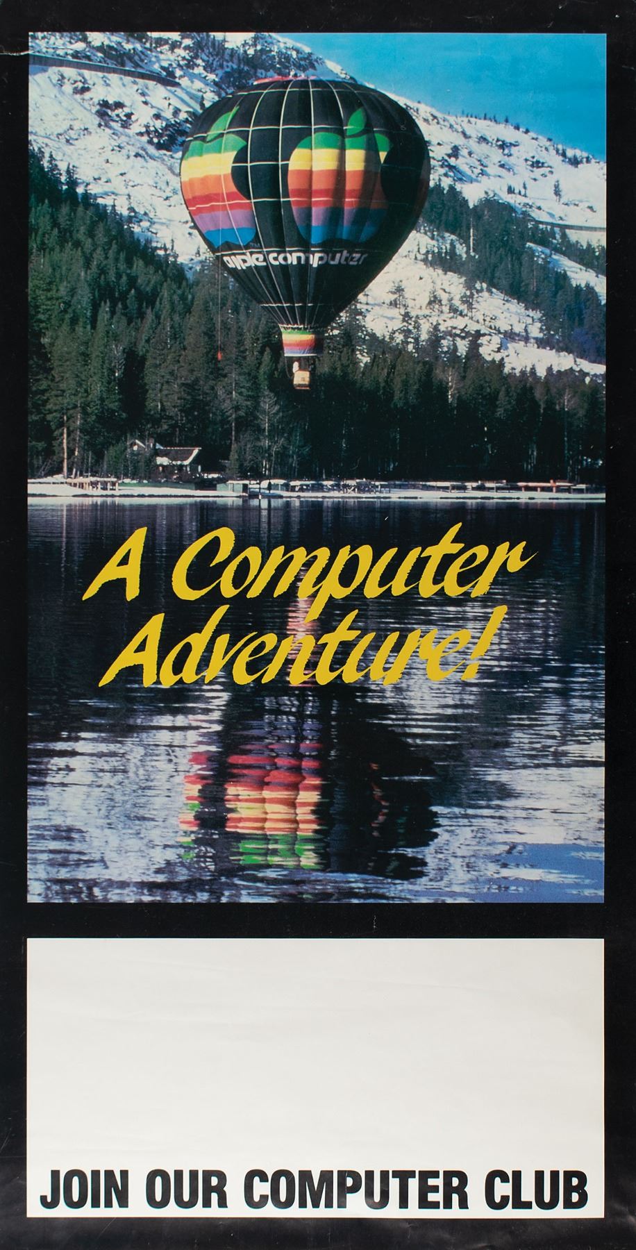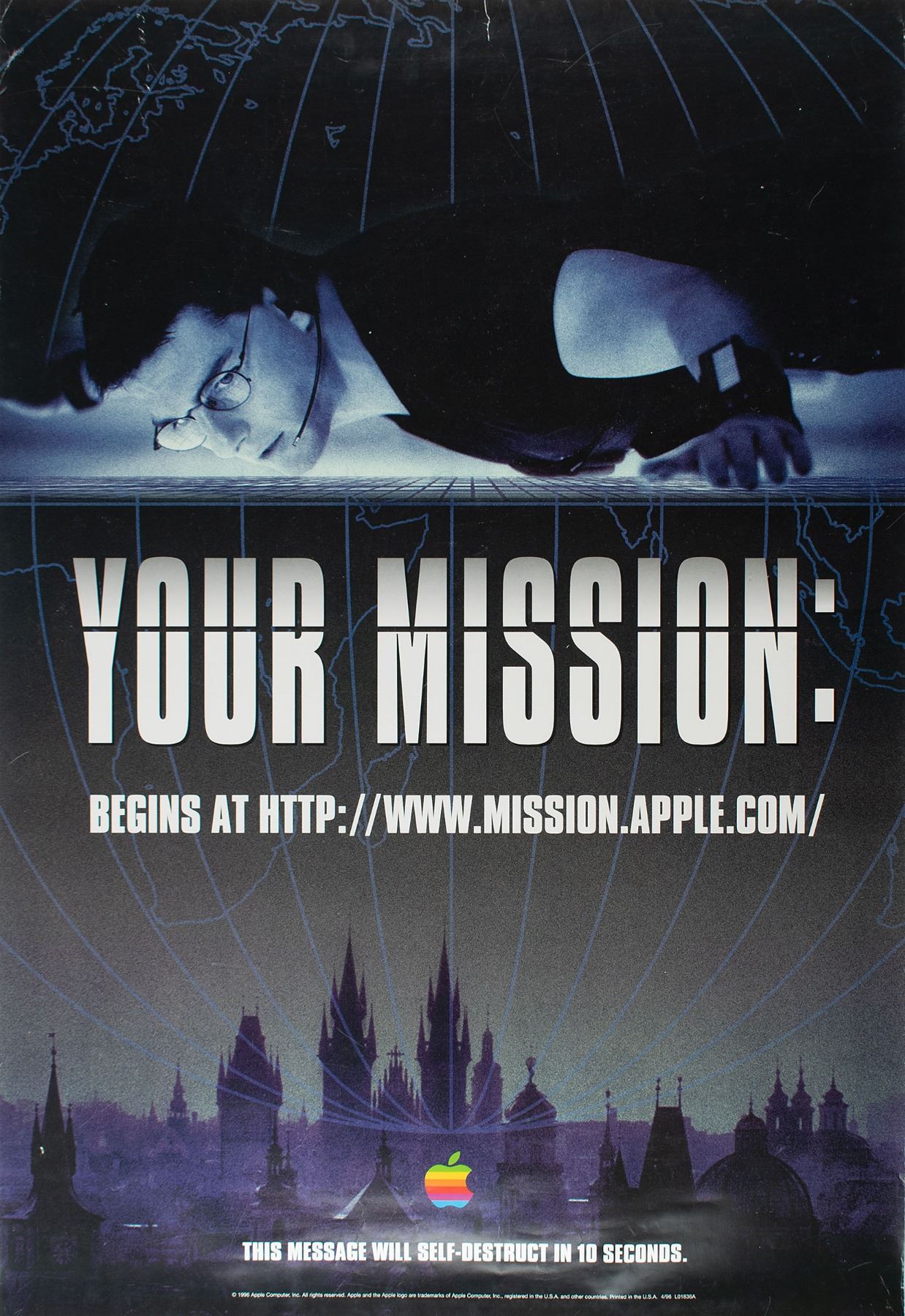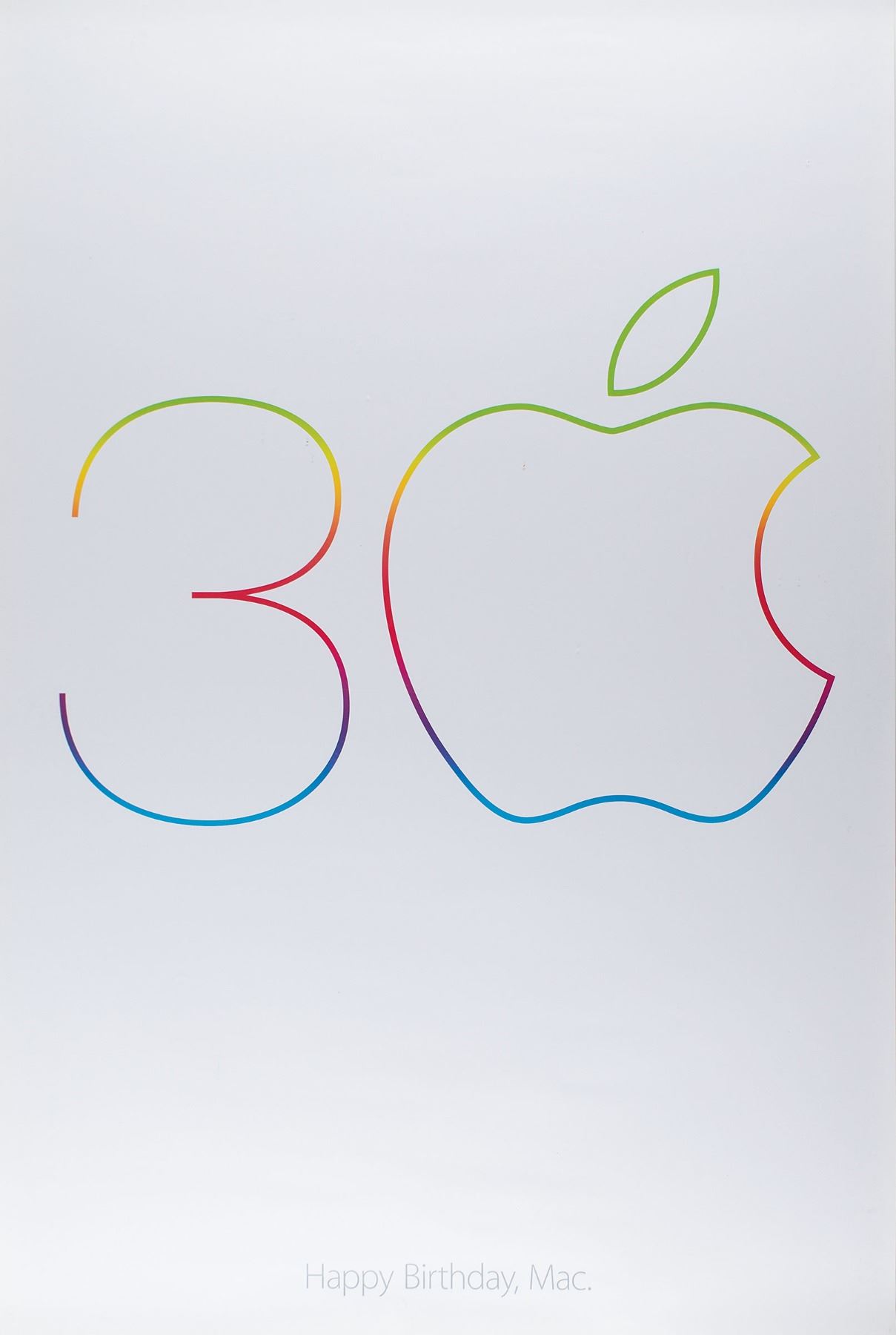 Appealing group lot of three uncommon promotional posters from Apple Computer, Inc. The first poster is a 2014 color 24 x 26 poster for the 30th anniversary of Apple's Macintosh 128K computer, which features a large “3” and Apple logo above gray text: “Happy birthday, Mac.” The second is a circa 1981 color 17 x 33 poster for the Apple Computer Club sent to elementary and secondary schools to encourage children to join computer and technology clubs, which depicts an Apple Computer hot air balloon floating over Lake Donner in California with yellow text, “A Computer Adventure,” and empty signature space below, “Join Our Computer Club.” Reverse of poster bears a description of the “Apple Computer Club Kit,” with instructions on how to obtain a free kit. The third poster is a color 26.5 x 38.5 poster for the 1996 film Mission:Impossible, which shows Tom Cruise suspended above bold white text: “Your Mission: Begins at http://www.mission.apple.com/.” Caption to lower margin reads: “This Message Will Self-Destruct in 10 Seconds.” Includes two smaller identical posters, both of which measure 13 x 19. The posters are rolled and in overall very good to fine condition, with some creases to edges of the Computer Club and larger Mission:Impossible posters; the Computer Club has a tear to upper left edge, and the Mission:Impossible has a tear to top edge. Apple Computer had a $15 million promotion linked to Mission:Impossible that included a game, print ads, a television spot, dealer and in-theater promos, and on-screen placement of Apple personal computers; it was an attempt on Apple's part to improve their image after posting a $740 million loss in its fiscal second quarter. These posters derive from the personal collection of a former employee of Apple Computer, Inc.