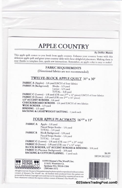 Pattern 'Apple Country' by Debbie Mumm for Mumm's the Word. Pattern includes instruction for twelve-block quilt 31" x 30" & placemats 16.5" x 11" MSRP $6.99