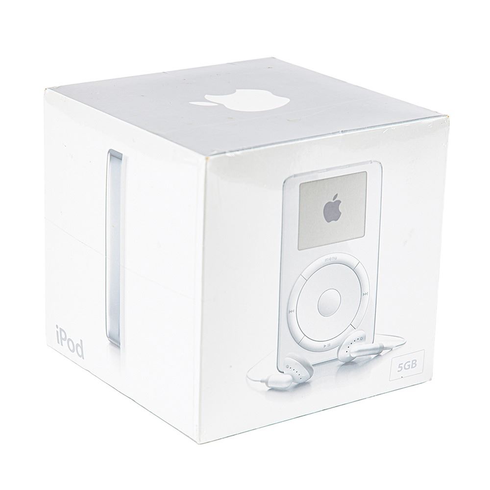 Sought-after unopened first generation Apple iPod Classic (5GB), Bob Marley special edition. The top of the box features the iconic Apple logo in white, with the four sides showing front and side views of the iPod, as well as a wonderful two-panel image of the aforementioned reggae legend with closed eyes and floating dreadlocks as he sings into a microphone. The base features the original $399 price tag, the iPod features and requirements list, and the manufacturers label with Part No. M8513LL/A, and Serial No. U22092M7LG6. In very fine, still-sealed condition.