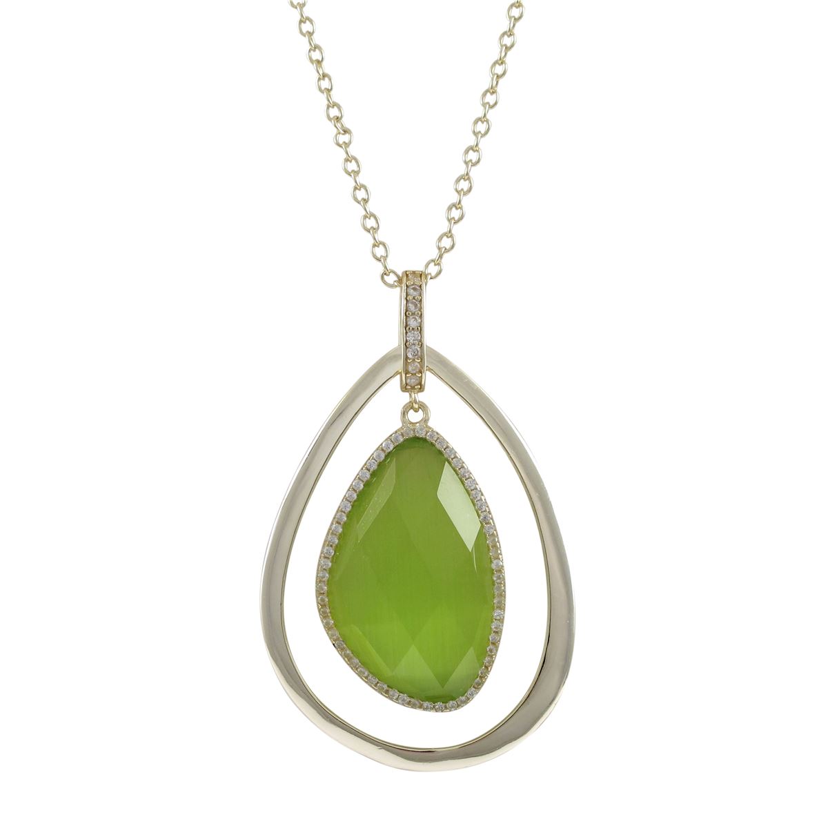 Apple Green Cat's Eye Semi Precious Stone In Gold Plated Sterling Silver Open Teardop CZ Pendant, 1.81&Quot;