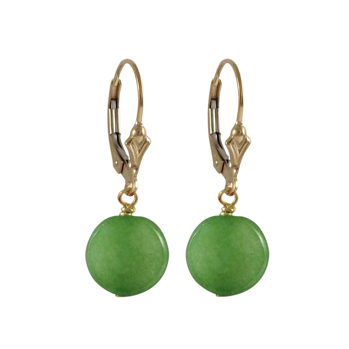 Apple Green Semi Precious 10Mm Round Flat Stone On Gold Filled Lever Back Earrings, 1.18"