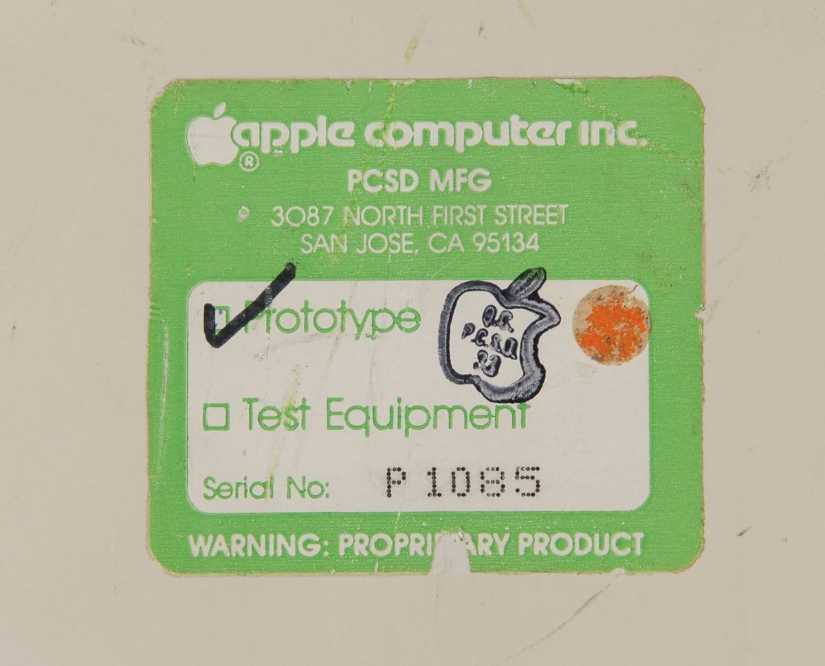 Sought-after Apple IIc prototype computer, identified on the bottom with a green “Apple Computer Inc.” label bearing an ink Apple inspection stamp, checked “Prototype,” with a serial number of “P1085.” The computer measures 11.5 x 12 x 2.5 and weighs 7.5 pounds. The prototype nature of this unit is further confirmed by the following features: there are no additional company names or product logos on the case; the case has a smooth finish, rather than textured; the date codes on the ICs and motherboard PCB, which date the boards to November 1983; and other design differences compared to the production model. In very good to fine condition, with some yellowing to the plastic.