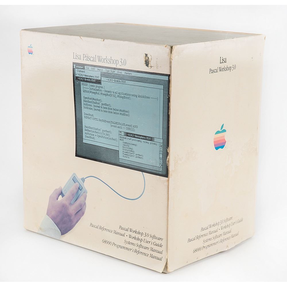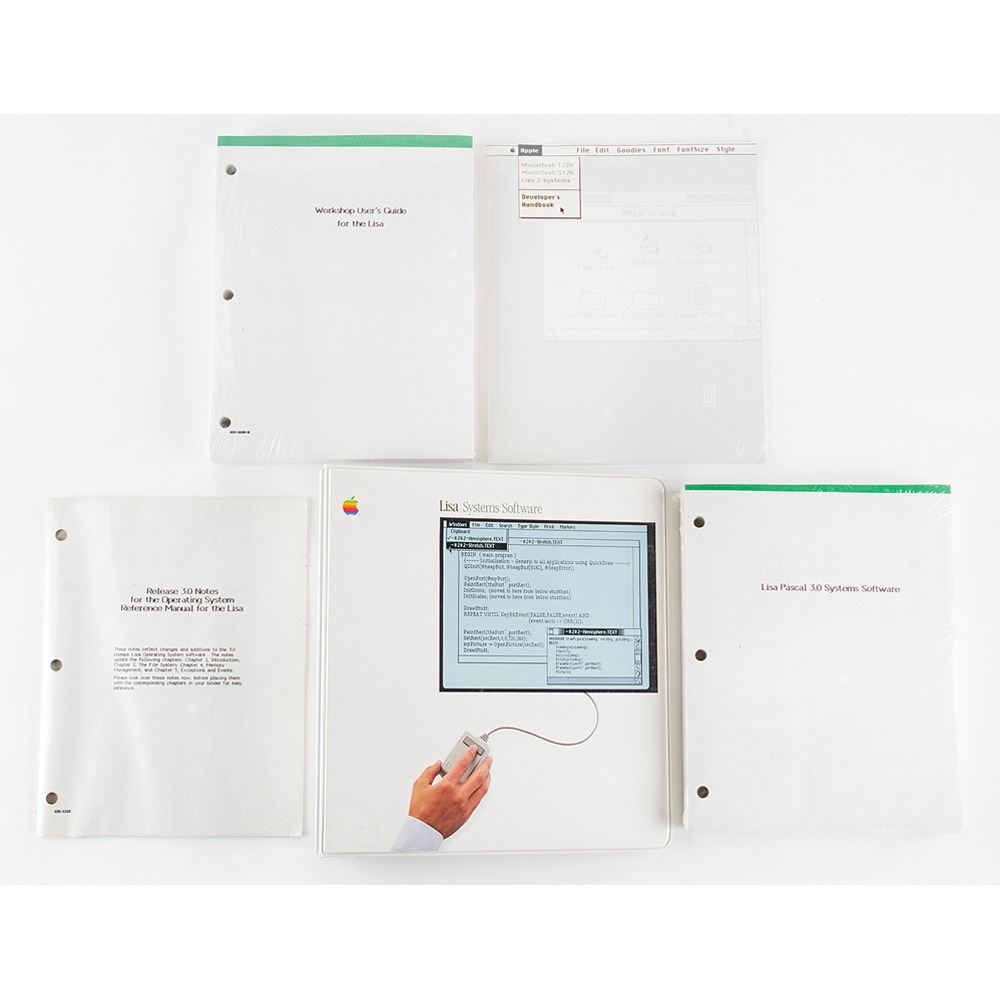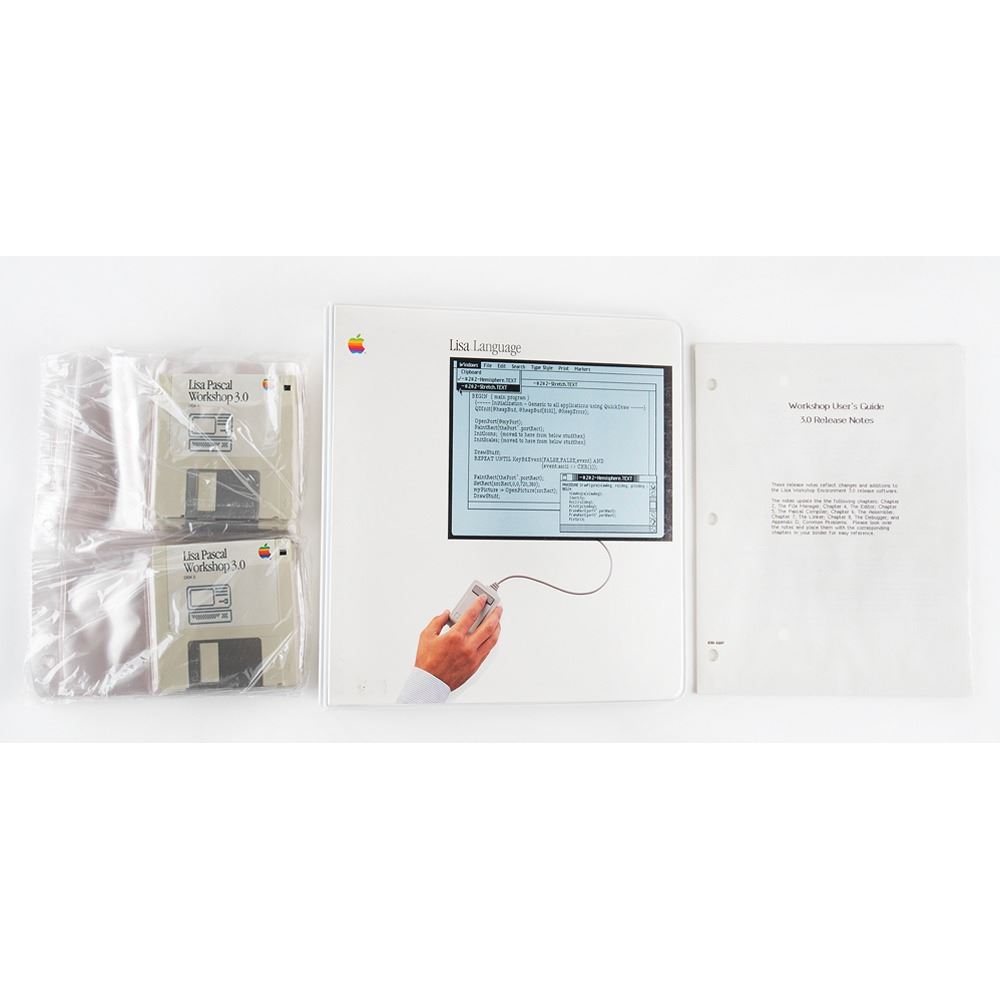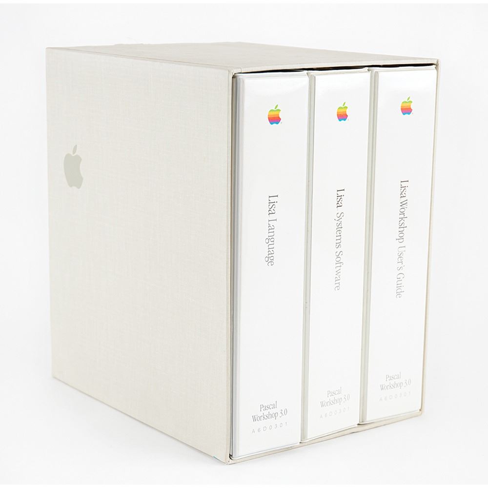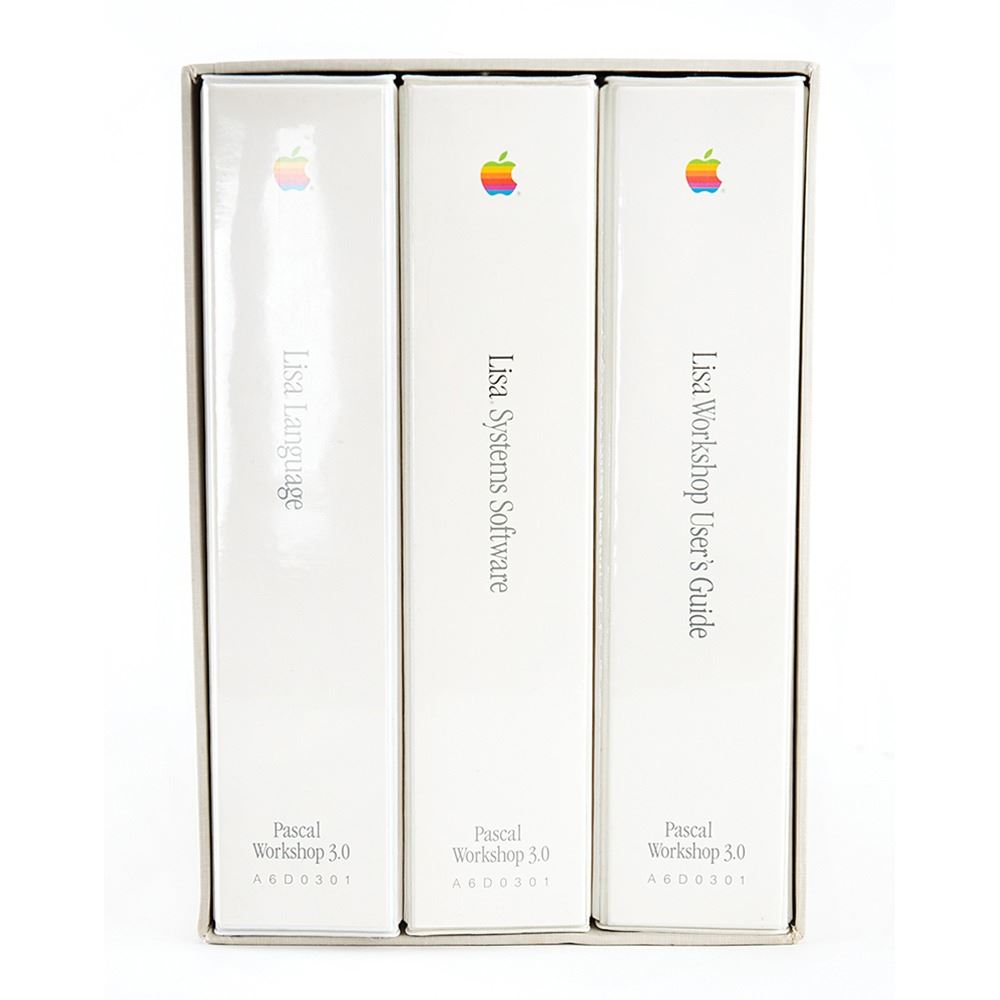 Uncommon factory-sealed Apple Lisa Pascal Workshop 3.0 software and reference material, comprising three binders housed in their original slipcase. The binders are labeled "Lisa Systems Software," "Lisa Language," and "Lisa Workshop User's Guide," with sealed contents including the right floppy discs for "Lisa Pascal Workshop 3.0," plus reference notes and user guides: "Release 3.0 Notes," "Lisa Pascal 3.0 Systems Software," "Workshop 3.0 Release Notes," "Developer's Handbook," "Workshop User's Guide for the Lisa," "Release 3.0 Notes for the Pascal Reference Manual for the Lisa," "Pascal Reference Manual," and "Motorola M68000 16/32-Bit Microprocessor Programmer's Reference Manual." The exterior slipcover is worn with a few edge tears, but the inner contents remain in fine, unused condition.