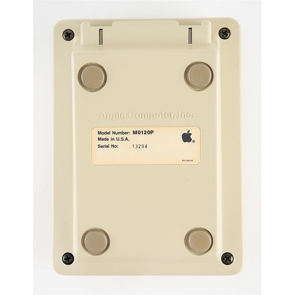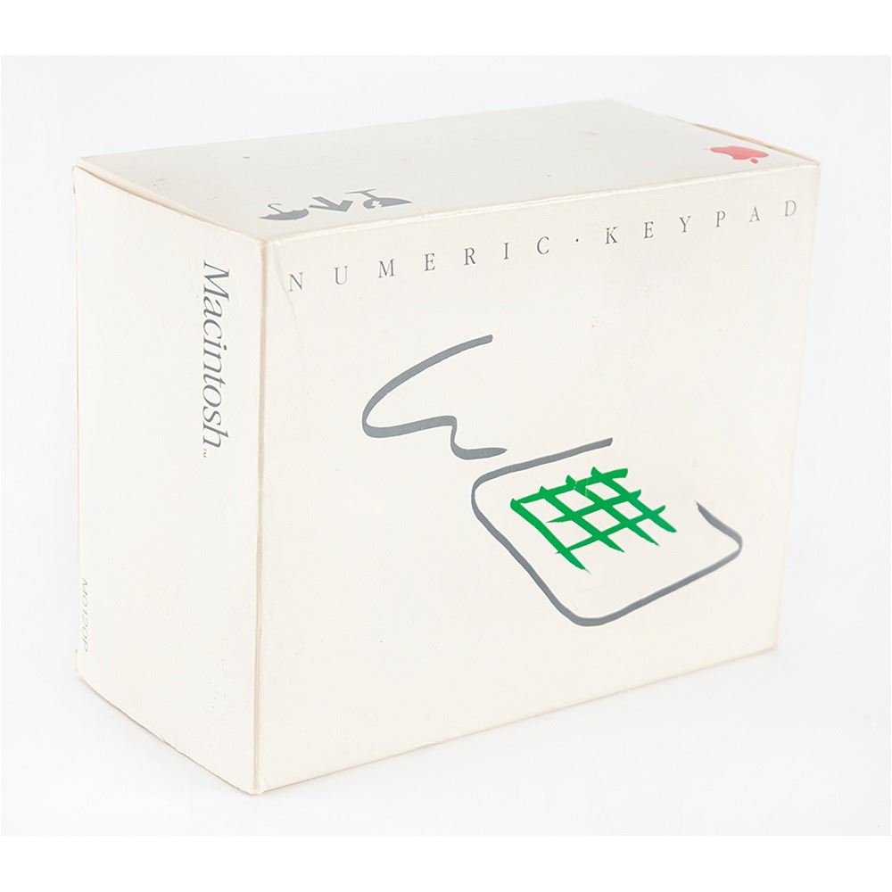 Uncommon original Apple M0120P Numeric Keypad in its original box and packaging, circa 1984, serial no. 13294. This external numeric keypad was designed as a companion to the original Macintosh keyboard (M0110), which only had numbers across the top. The M0110's successor, the Apple M0110A, integrated the numeric keypad, making the M0120 redundant. The M0120P is distinguished from the M0120 by its use of symbols, rather than text, for the "Enter" and "Clear" keys. Complete with its original cable.