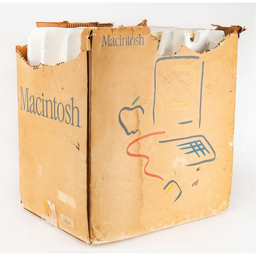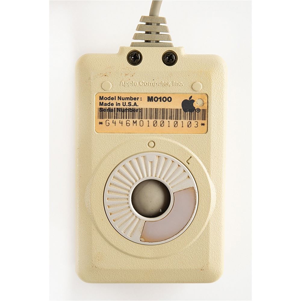 Original Apple Macintosh 128K computer from 1984, Model No. M0001, Serial No. F4473G3M0001, with the FCC ID plate on the back, and the serial number label affixed underneath the front bezel. The serial number indicates that this Macintosh was the 4015th manufactured during the 47th week of 1984 in Fremont, California. Includes its partial original box and styrofoam packing material, along with its power cable, Macintosh Mouse (M0100), Macintosh Keyboard (M0110), floppy disks, manuals, invoice, and unused decals. The computer and accessories are in very good to fine cosmetic condition, with some adhesive remnants to cables and expected age toning; the original box is scuffed and missing portions of the top.