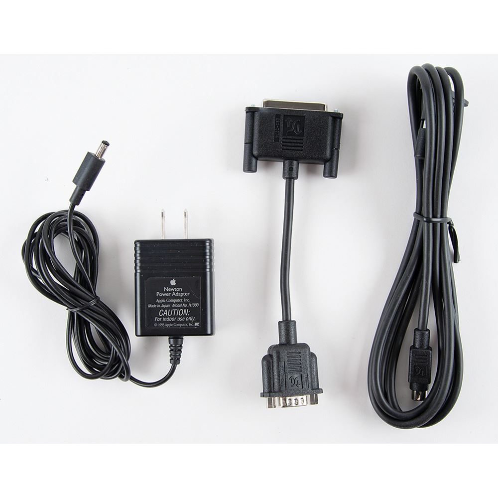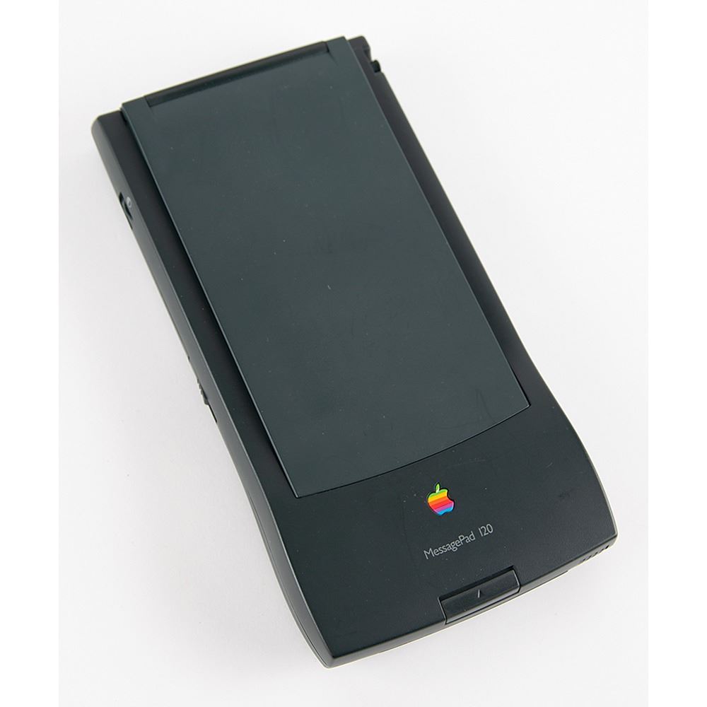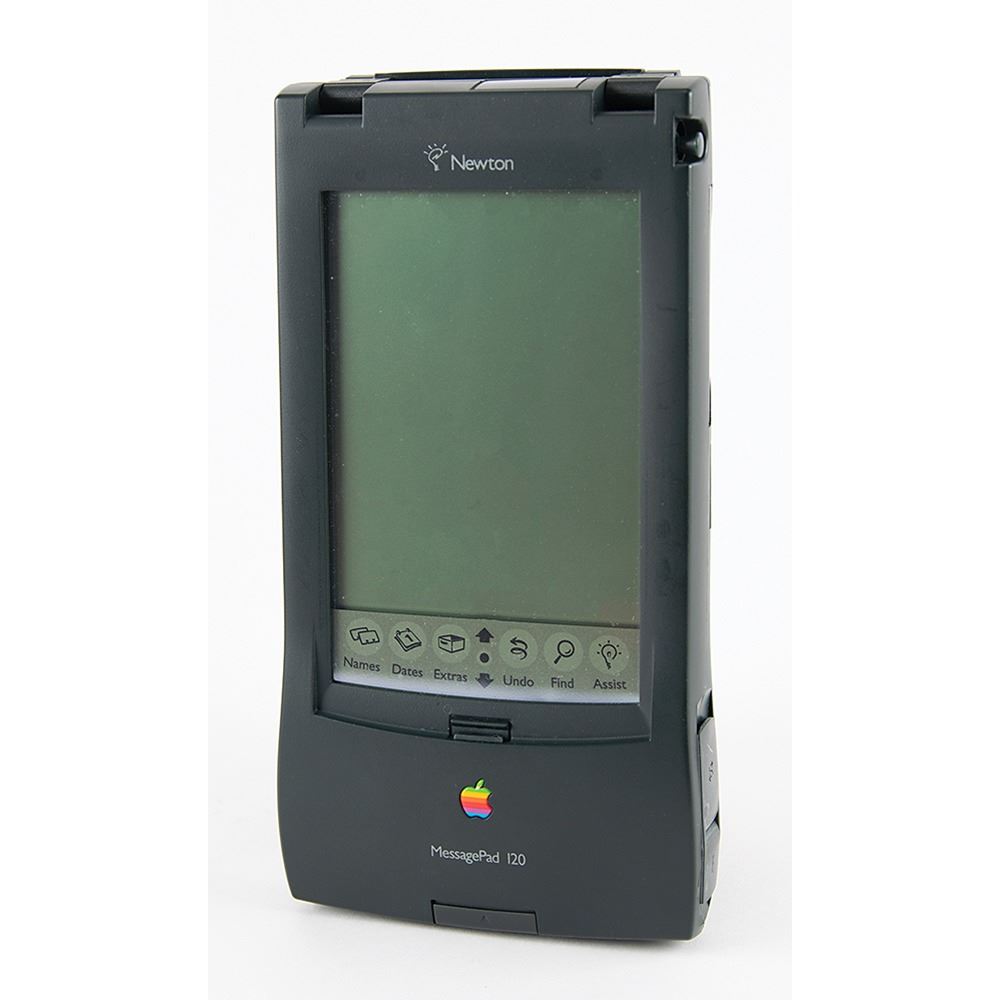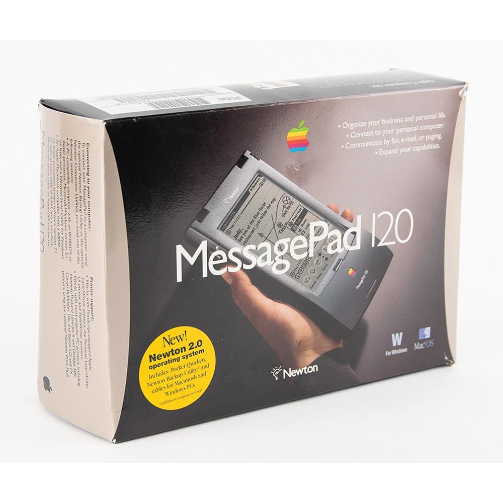 A Newton MessagePad 120 by Apple Computer with Newton 2.0 operating system, built-in 2MB of RAM, 8MB of ROM, a 20-MHz ARM 610 RISC processor, and more. The MessagePad comes with the original box and its featured accessories, including a stylus, four AA alkaline batteries with cases, adapter cords, and the handbook. In fine condition, with some wear to the box. The Newton MessagePad was one of the first series of handheld systems, or PDAs (Personal Digital Assistants), to attempt to recognize natural handwriting and use a basic form of artificial intelligence to 'tie' relevant information together.