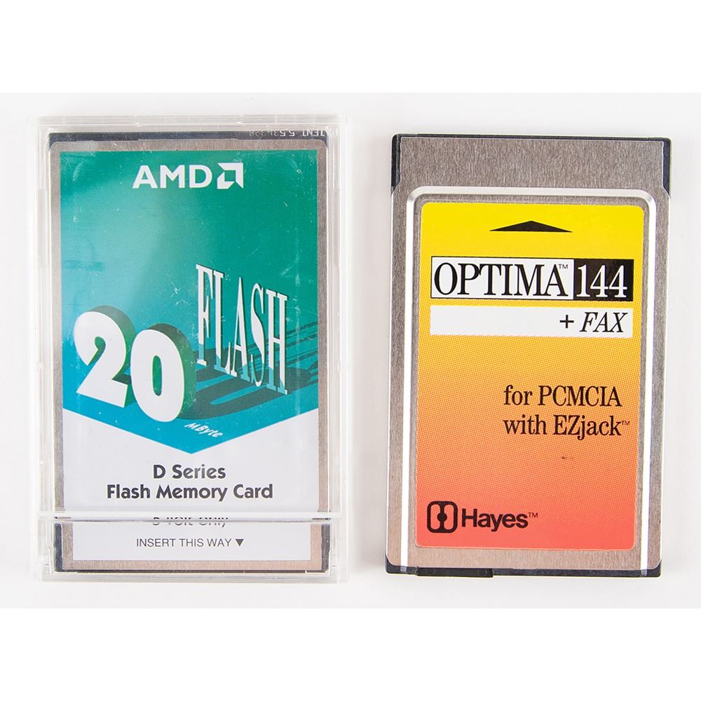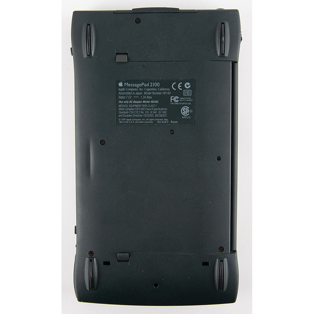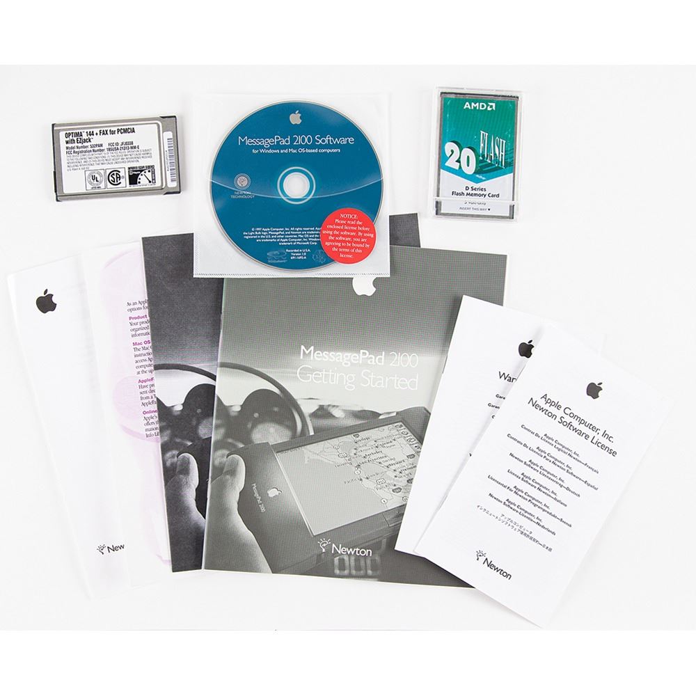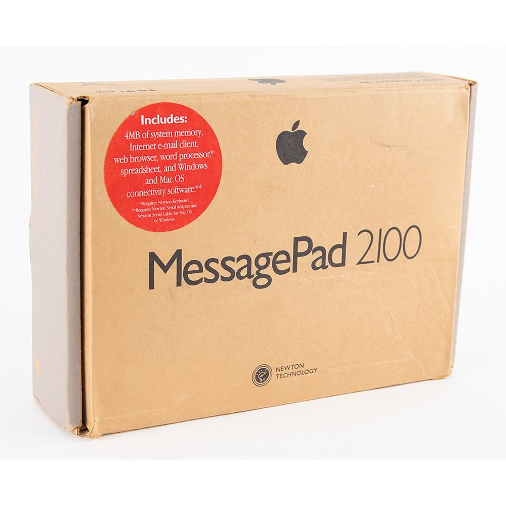 A Newton MessagePad 2100 by Apple Computer with built-in 8MB of RAM (4MB of DRAM and 4MB of flash memory), 160-MHz StrongARM SA-110 RISC processor, built-in speaker and microphone for voice recording and playback, and more. The MessagePad comes with the original box and its featured accessories, including: a 9W power adapter, a stylus, an AMD 20MB D Series flash memory card, a Hayes Optima 144 data and fax card, and all warranties with handbook and user’s manual. In fine condition, with some wear to the box. The Newton MessagePad was one of the first series of handheld systems, or PDAs (Personal Digital Assistants), to attempt to recognize natural handwriting and use a basic form of artificial intelligence to 'tie' relevant information together.