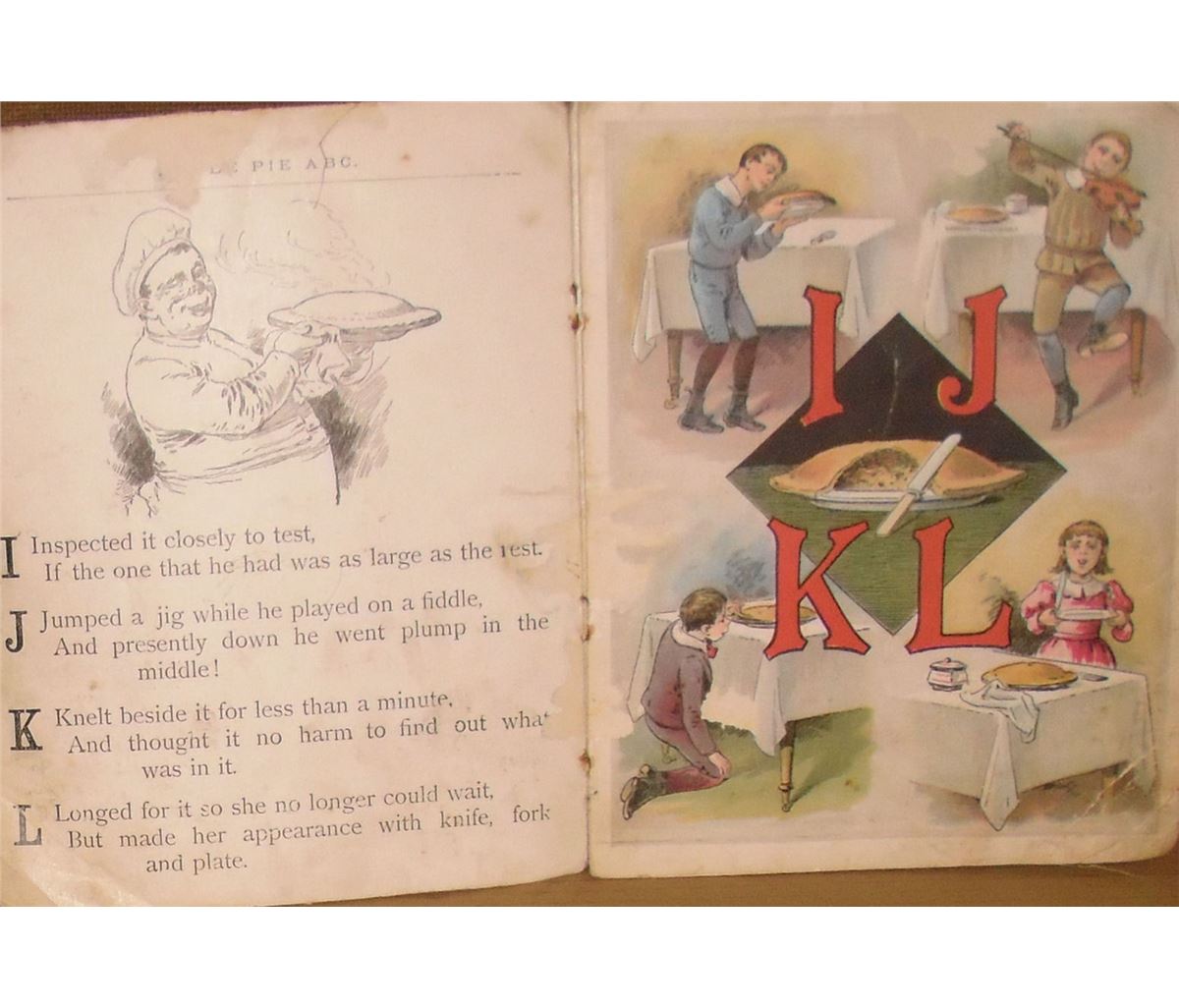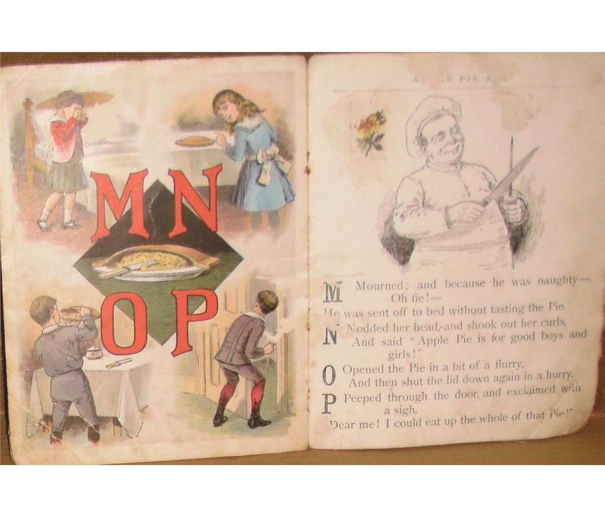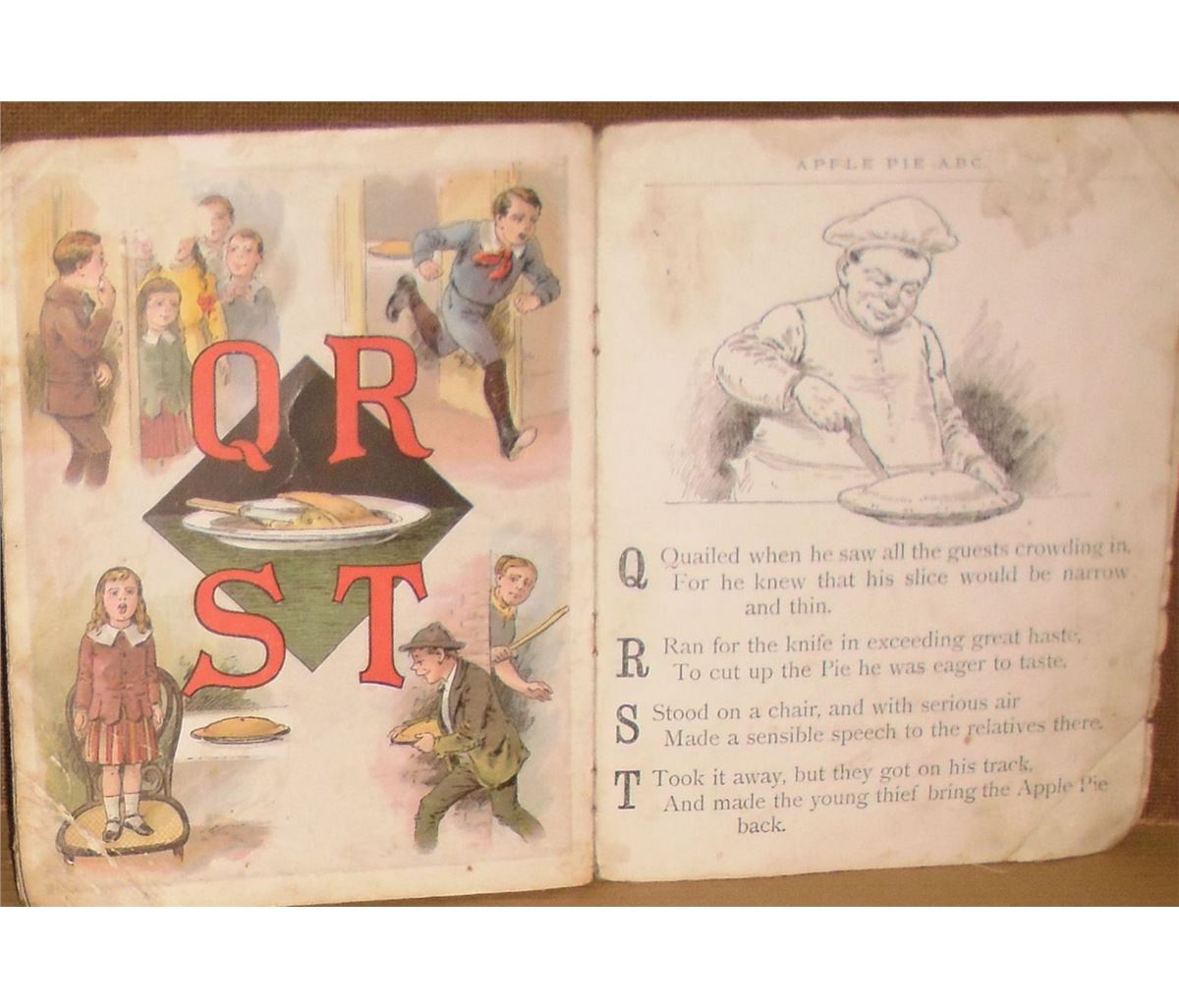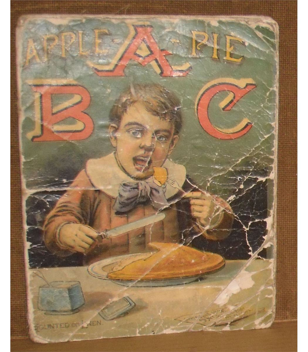 Antique "Apple Pie ABC" is a rare find with very used cover and interior pages very readable and great with colours and texts; on linen; the drawings are delightfully done and so interesting on each double page, which has also coloured letters and imageries with still very bright colours for this collectible very old aged small book about 10 high x 8 inches; add this fun one to your collection or gave like to educate !