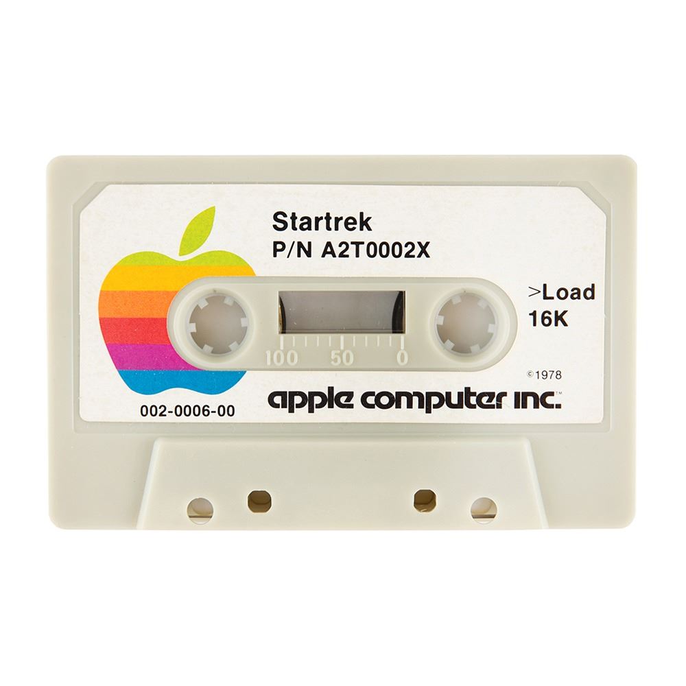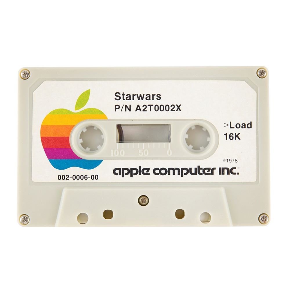 Original Apple-produced Star Wars/Star Trek cassette tape game released in 1978 for the Apple II, featuring the unlicensed software "Starwars, P/N A2T0002X" and "Startrek, P/N A2T0002X." This was the first Star Wars game ever released, casting the player as a 'space pilot trainee' who destroys TIE fighters using a first-person heads-up display. The original Star Wars movie had been released only a year earlier, and Apple hoped to capitalize on the Skywalker-mania that gripped the nation. The inclusion of the Star Trek game made this cassette a grand unification of sci-fi fandom. These tapes were manually copied as orders came in, using a rig that fed eight recording tape drives from one masteran innovative example of the 'print on demand' model used by many businesses today!