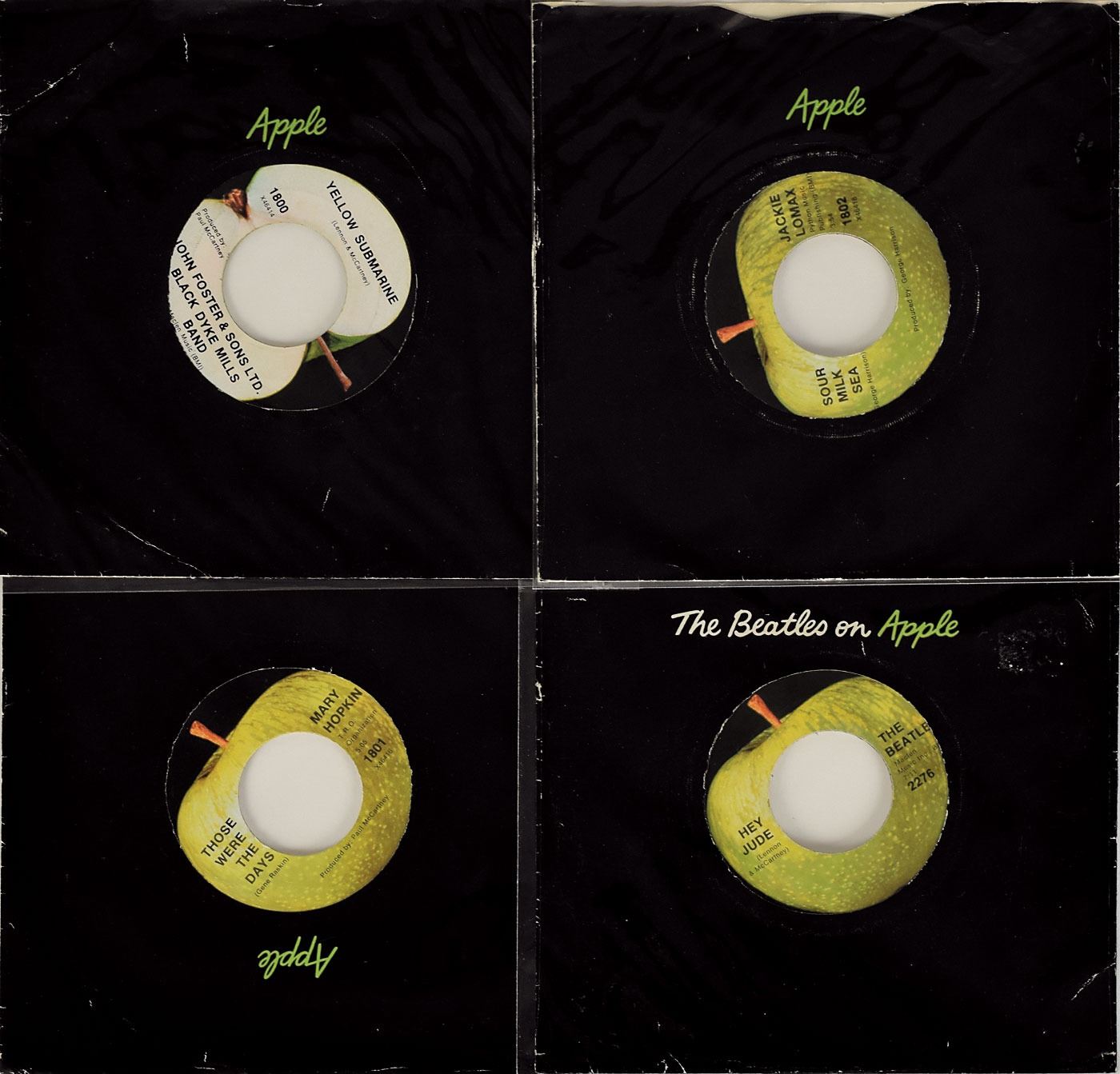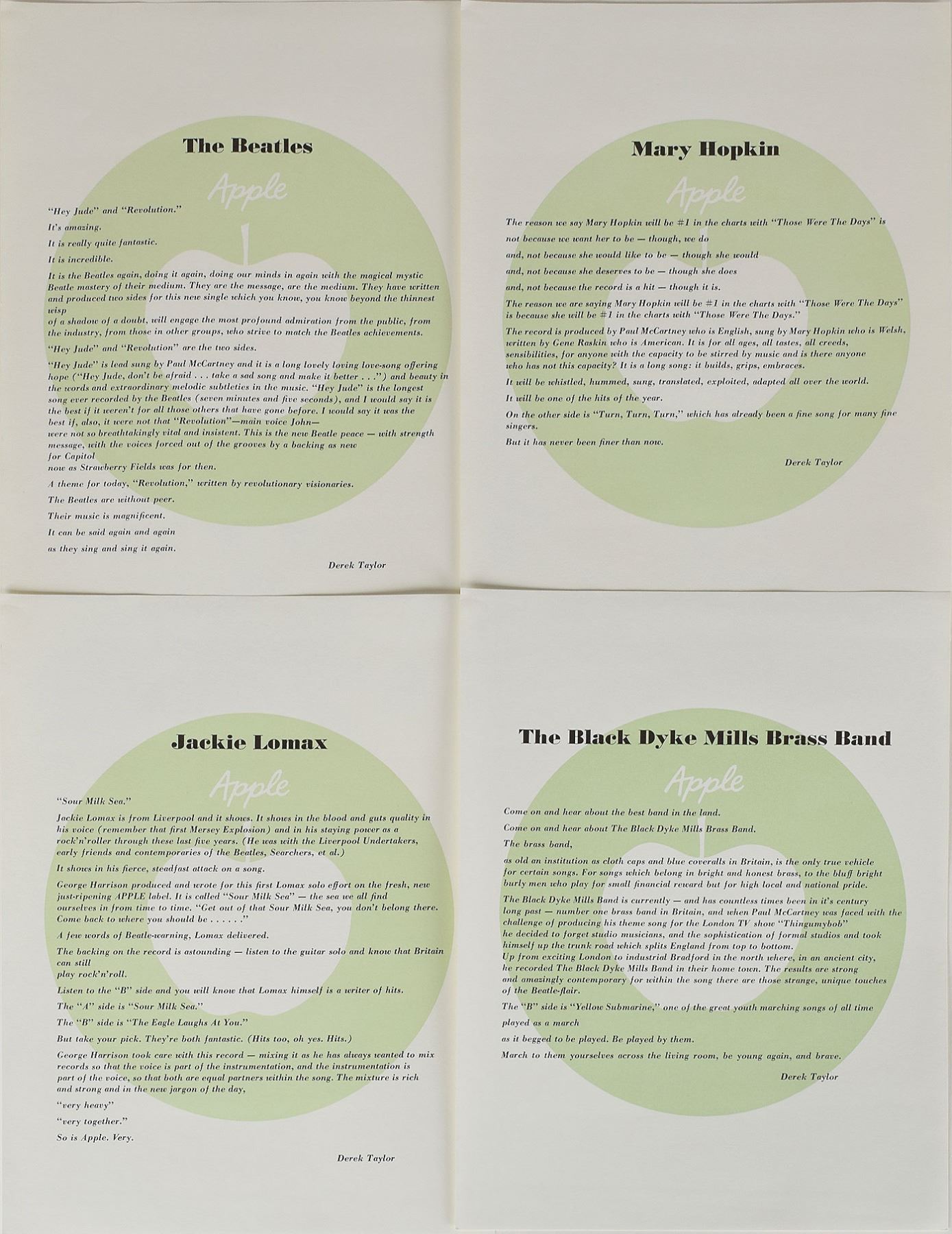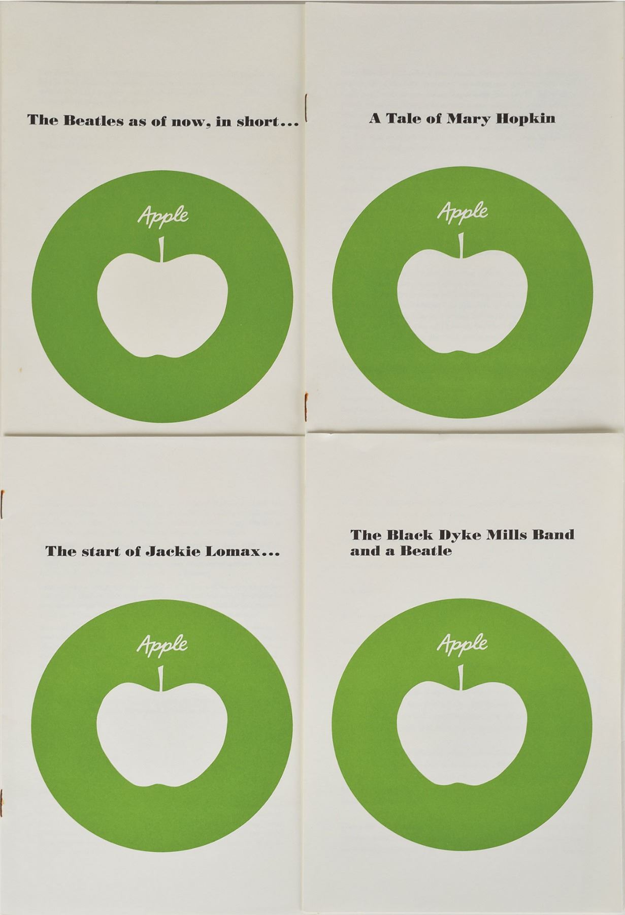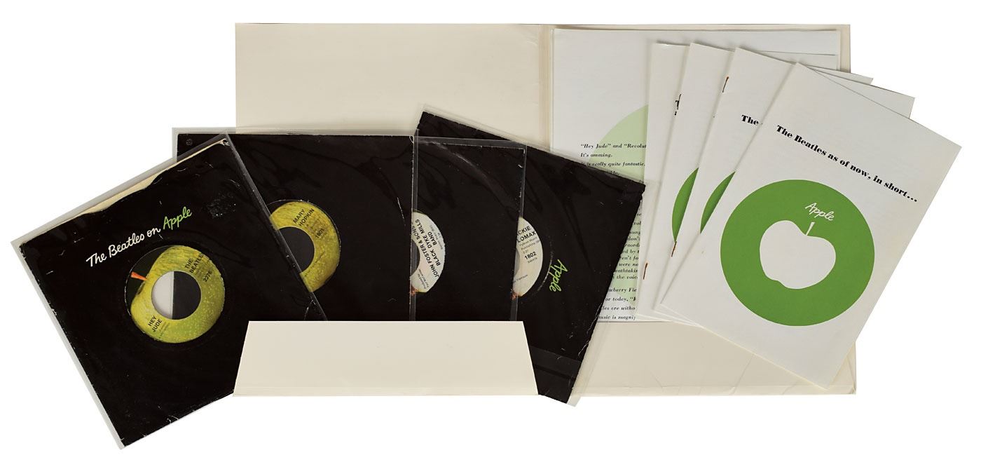 Very rare original Apple Records 1968 US press kit, used to introduce the new record label to the United States, highlighting their first four artists: the Beatles, Jackie Lomax, Mary Hopkin, and the Black Dyke Mills Brass Band. The official “Apple” folder contains four 45 rpm discs with sleeves, with corresponding sets of four of press photos, booklets, and info sheets. The 45 rpm singles included are: ‘Hey Jude / Revolution’ by the Beatles; ‘Sour Milk Sea / The Eagle Laughs at You’ by Jackie Lomax; ‘Those Were The Days / Turn, Turn, Turn’ by Mary Hopkin; and ’Thingumybob / Yellow Submarine’ by the Black Dyke Mills Brass Band. The press photos show each artist (the Beatles are portrayed as their Yellow Submarine cartoons), the booklets give background information on the artists, and the info sheets provide reviews by English publicist Derek Taylor. In fine condition, with some light creasing to the white folder and some partial splitting to edges of the record sleeves. On August 22, 1968, these press kits were sent out to radio station program directors across the United States, serving as an introduction to the Beatles’ important new project—Apple Records. The highlight of the set is the rare first Los Angeles pressing of the 'Hey Jude' single, packaged in a sleeve reading “The Beatles on Apple.” An absolutely spectacular surviving example of this significant introductory press kit.