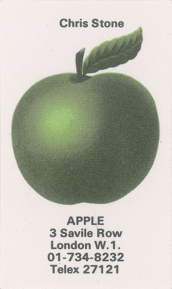 Apple Records business card belonging to Chris Stone, 1.75 x 2.75, listing the "3 Savile Row, London" address with the famous Apple Records logo. In very fine condition. Stone worked under Tony King in Apple’s artist promotion department. Accompanied by a certificate of authenticity from Tracks.