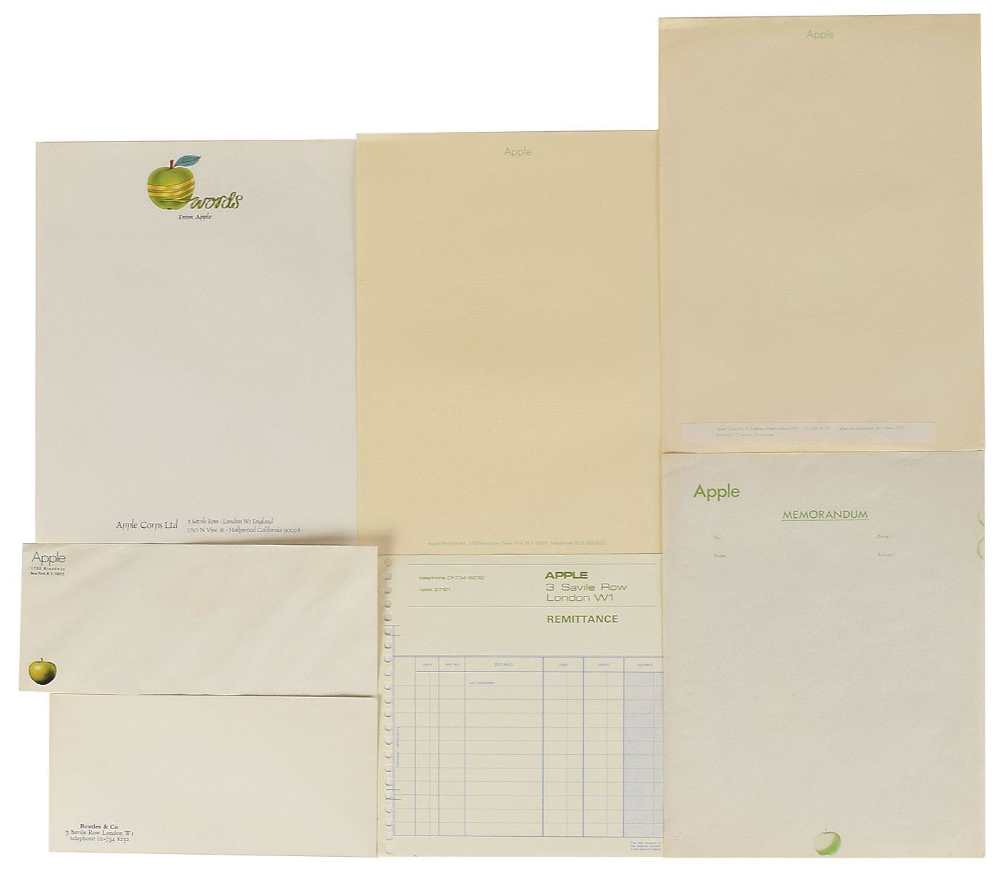 Collection of ephemera from the London and New York offices of Apple Records, including: a US stationery envelope with their NYC return address; a UK stationery envelope with the London address for "Beatles & Co"; a blank UK remittance form; a blank sheet of US stationery; a blank sheet of memorandum stationery; a blank sheet of "Words from Apple" stationery; and a blank sheet of UK stationery. In overall fine condition.