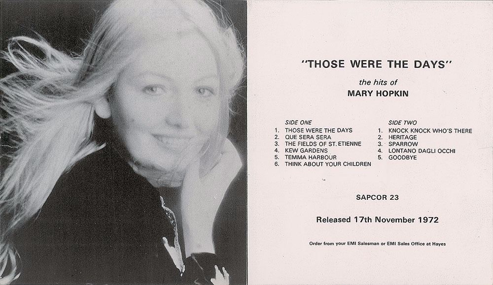 Apple Records "Fresh from Apple" leaflet advertising the release of Mary Hopkin's third studio album Those Were the Days on November 17, 1972, two pages, 6 x 7, featuring the record label's logo on the front, and an image of Hopkin and release information on the inside. In fine condition, with one small edge tear. Accompanied by a certificate of authenticity from Tracks. Sometimes credited as Mary Visconti, Hopkin is a Welsh folk singer best known for her 1968 chart-topping single 'Those Were The Days,' which was produced by Paul McCartney. The song reached number two on the Billboard Hot 100, trailing only behind The Beatles' classic 'Hey Jude.' Hopkin was one of the first musicians to sign to The Beatles' Apple label.