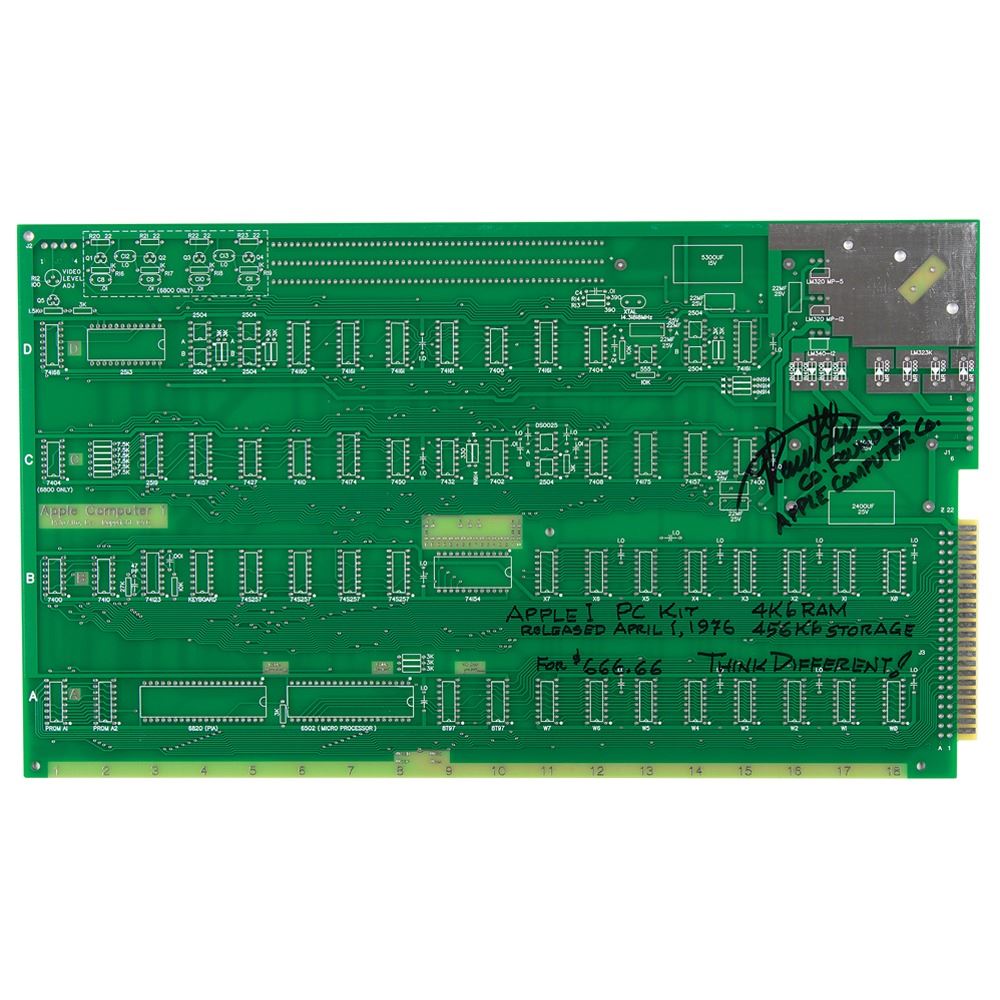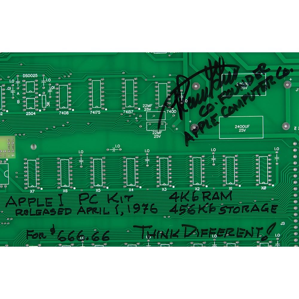 Desirable replica of the Apple-1 Computer circuit board, 15.5 x 9, signed in black felt tip, "Ronald Wayne, Co-Founder Apple Computer Co., Apple I PC Kit Released April 1, 1976, 4Kb RAM, 456Kb Storage, for $666.66, Think Different!" In very fine condition.