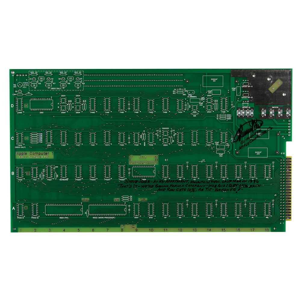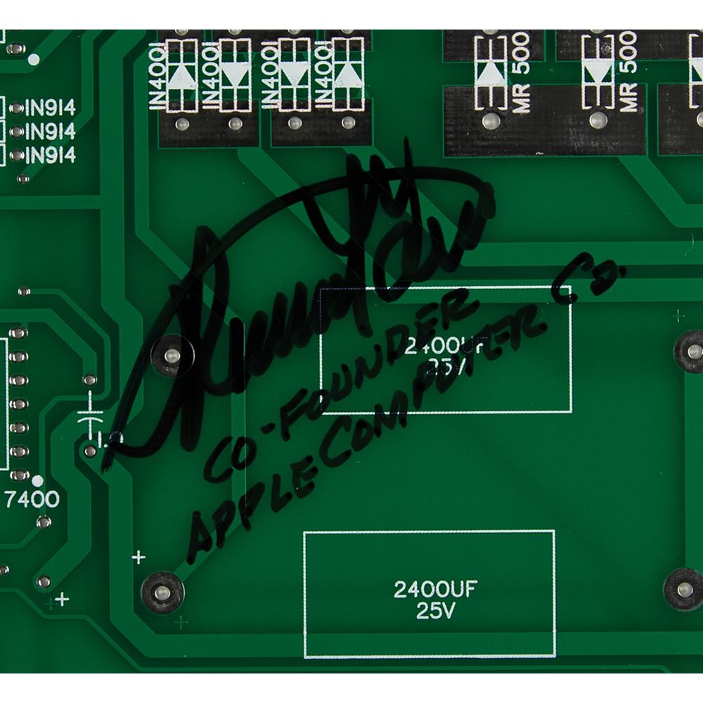 Desirable replica of the Apple-1 Computer circuit board, 15.5 x 9, signed in black felt tip, "Ronald Wayne, Co-Founder Apple Computer Co., Steve Jobs—at my apartment, Mountain View, Calif., March 1976: 'That's it—we're gonna form a company—Woz and I get 45% each and Ron gets 10%, as tie-breaker!'" In very fine condition.