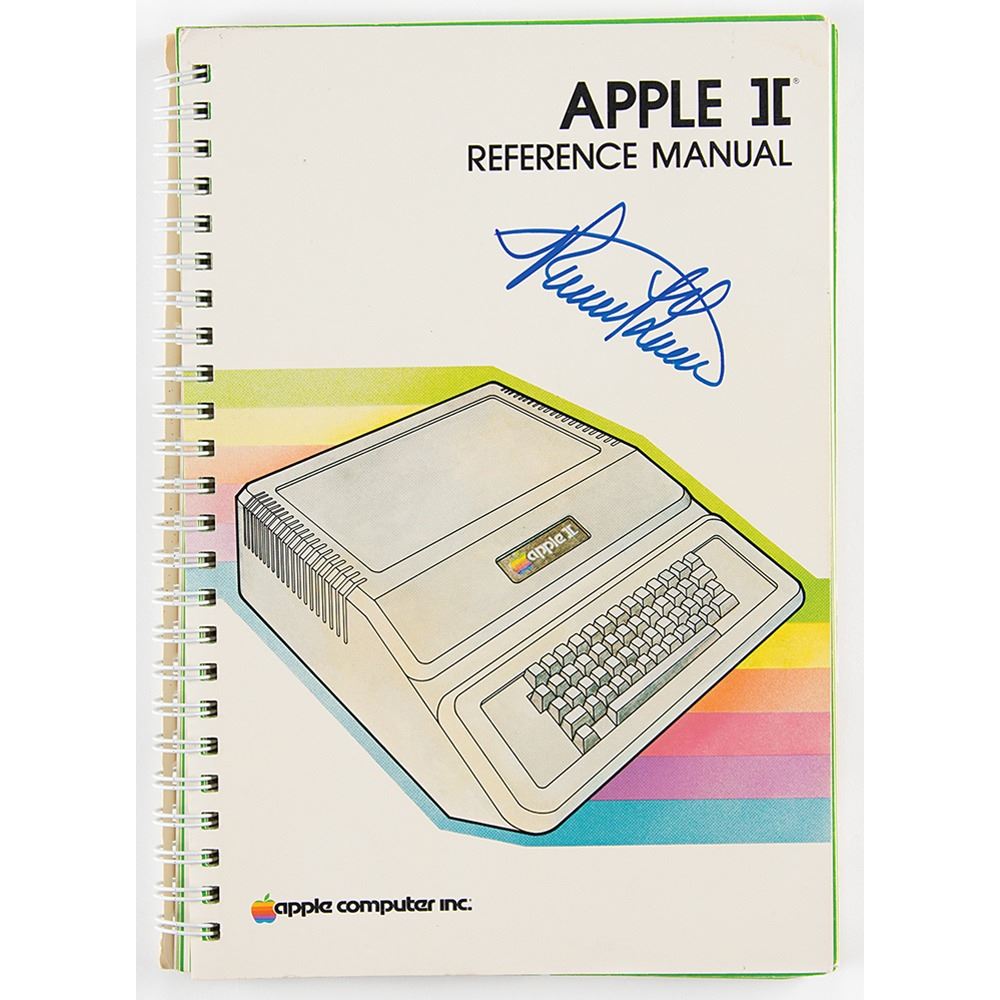 Spiral-bound Apple II reference manual, 196 pages, 6 x 8.5, signed on the front cover in blue felt tip by the Apple co-founder, "Ronald Wayne." In fine condition, with light handling wear.