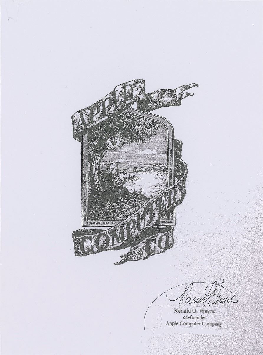 Co-founder of Apple Computer along with Steve Jobs and Steve Wozniak (born 1934). Laserprint copy of the original logo design for Apple Computer Co., 7.5 x 10, signed in the lower right in black ink, “Ronald G. Wayne,” over his embossed personal seal. In fine condition. Wayne received a 10% stake in Apple as one of the company’s three founding partners, but he relinquished his equity only two weeks later for the sum of $800. He was the designer of this logo, which depicts Isaac Newton under a tree with an apple dangling above.