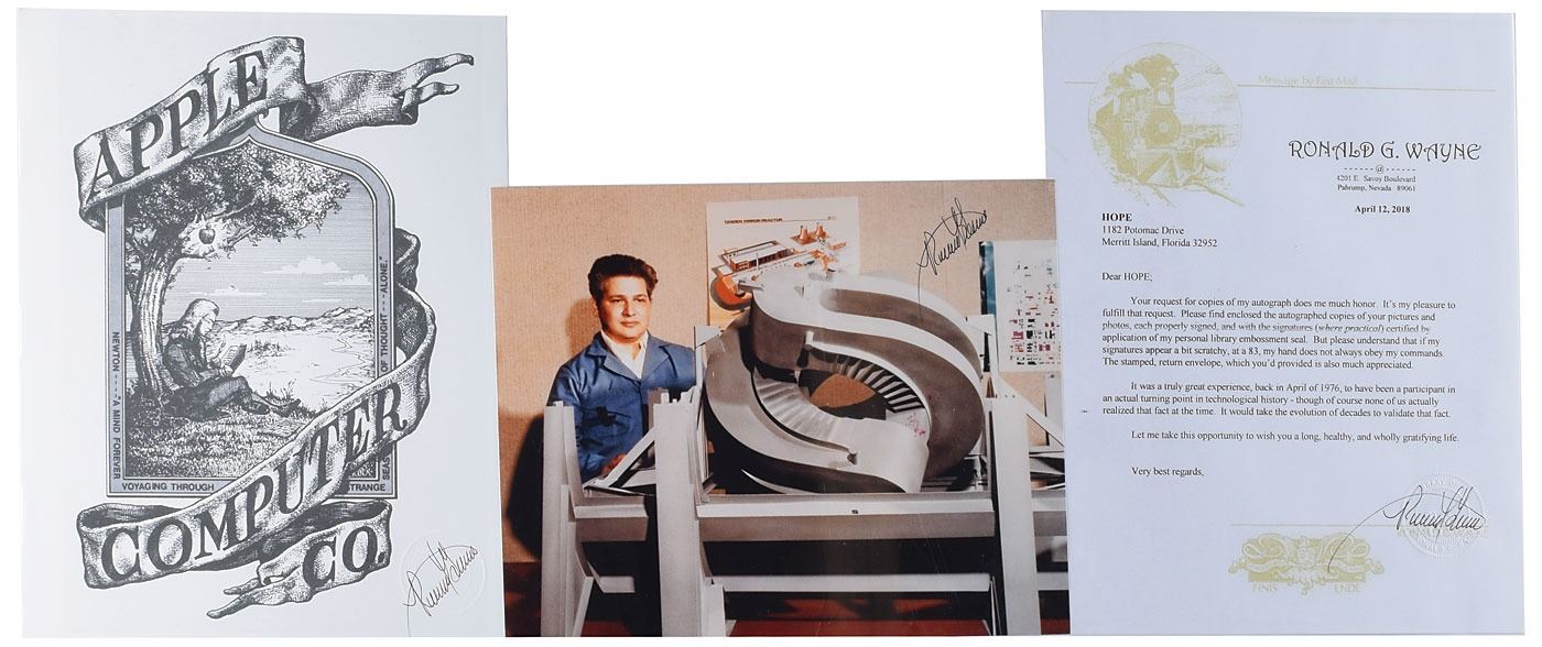 Three items: an 8.5 x 11 laserprint photo of the original logo design for Apple Computer Co., signed in the lower right in black ink, “Ronald G. Wayne,” over his embossed personal seal; a color glossy 10 x 8 photo of Wayne seated behind a large piece of mechanical equipment, signed in black ink, “Ronald G. Wayne,” over his embossed personal seal; and a TLS, one page, 8.5 x 11, personal letterhead with embossed personal seal, April 12, 2018. In overall fine condition. Accompanied by the original mailing envelope, and Wayne's personal business card, which he has signed in black ink, “Ronald G. Wayne." Wayne received a 10% stake in Apple as one of the company’s three founding partners, but he relinquished his equity only two weeks later for the sum of $800.