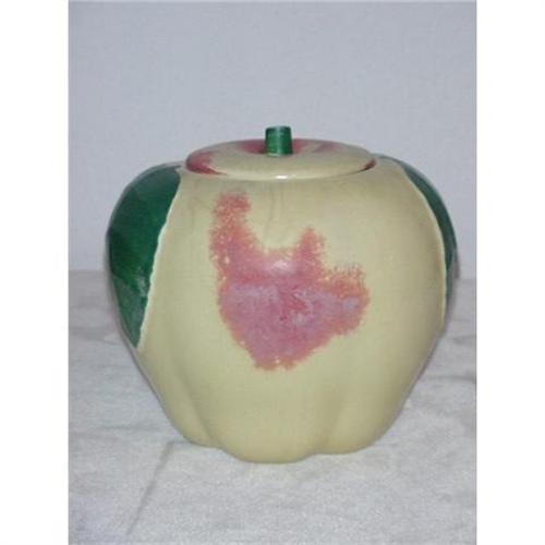 A nice big "Apple" cookie jar, 8 1/2" tall, yellow apple with big green leaves and green stem. Unmarked. Condition is good there is very visible crazing but no chips or cracks. Finish is dull, likely from washing and use. (4)