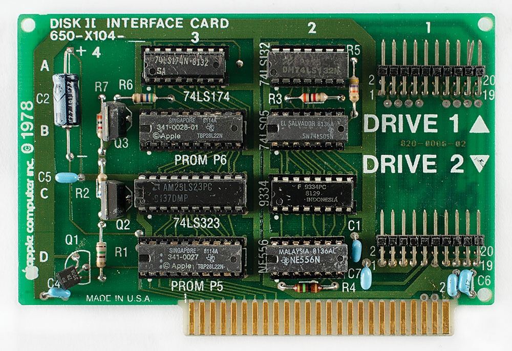 A 1978 Apple Computer Disk II interface card (650–X104), 4.5 x 3, signed in black felt tip, "Woz." In fine condition.