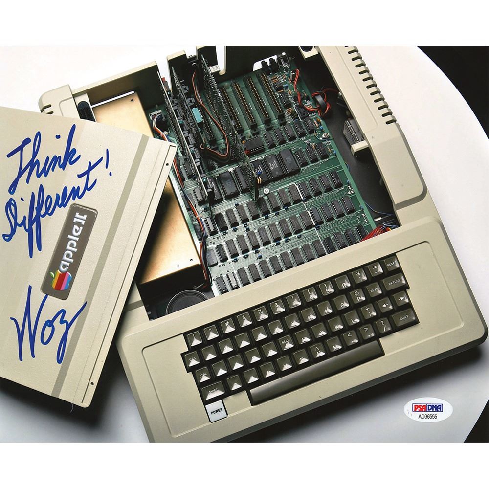 Color glossy 10 x 8 photo of an open Apple II computer with revealed motherboard, signed in blue felt tip by Apple co-founder Steve Wozniak, "Think Different! Woz." In very fine condition, with a PSA/DNA label affixed to the lower right corner. Accompanied by a certificate of authenticity from PSA/DNA.